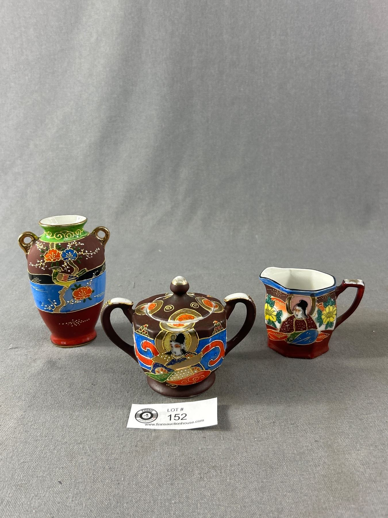 3 Beautiful Vintage Pieces Of Japanese Satsuma - Cream & Sugar Set Plus 5"H Vase