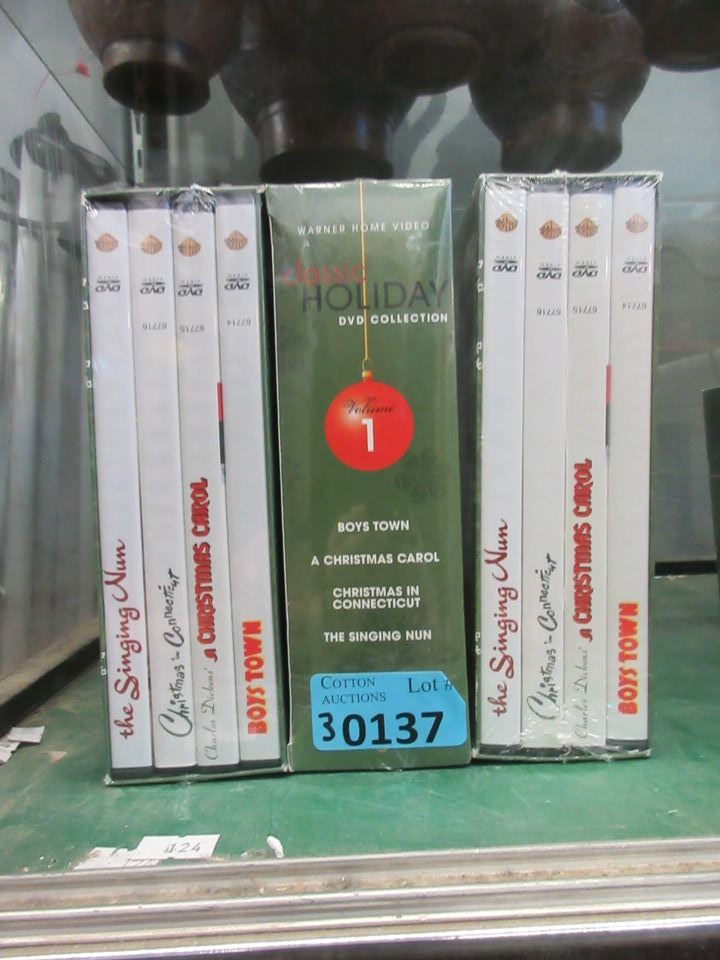 Sealed boxes. "Boys Town", "Christmas in Connecticut", Dickens "A Christmas Carol", and "The Singing Nun".