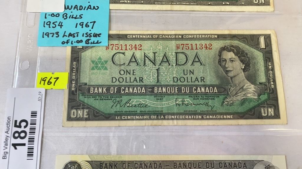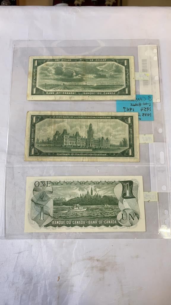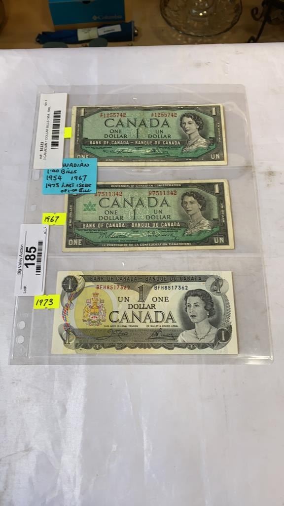 3 CANADIAN 1 DOLLAR BILLS 1954, 1967, 1973 - LAST YEAR OF BILL