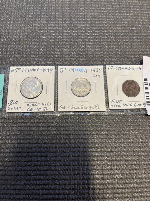 3 CANADIAN 1937 COINS - FIRST KING GEORGE VI SILVER 25 CENT .800