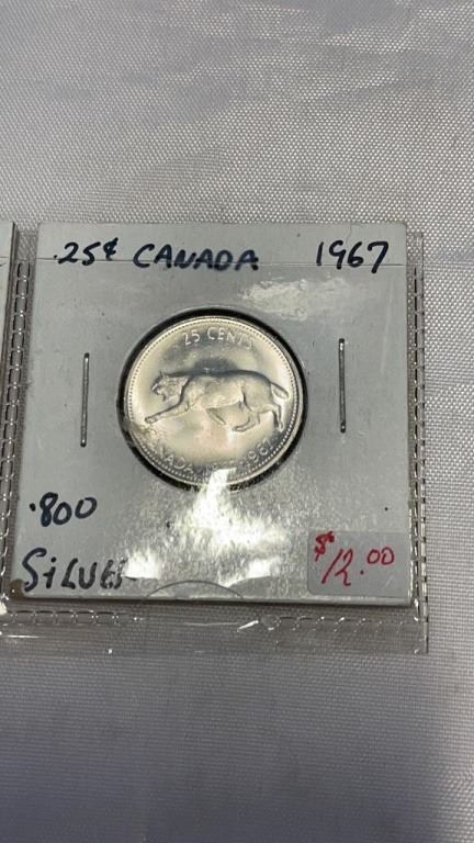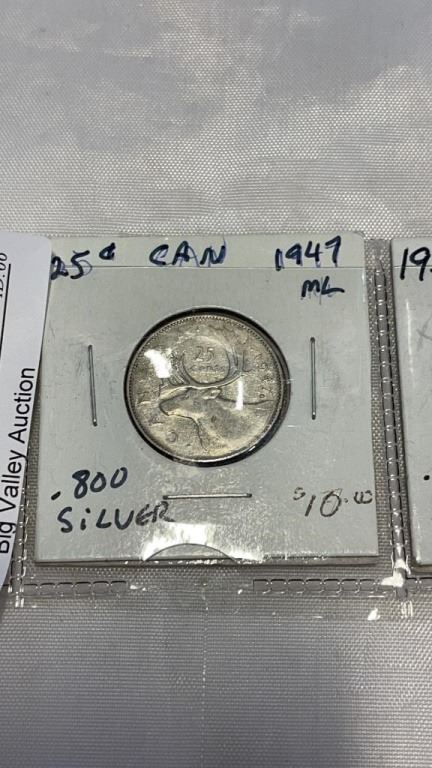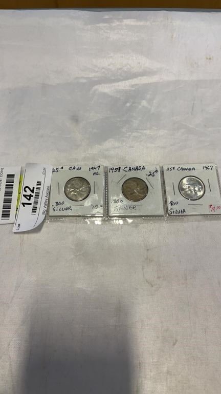 3 CANADIAN .800 SILVER 25 CENT COINS 1947, 1957, 1967