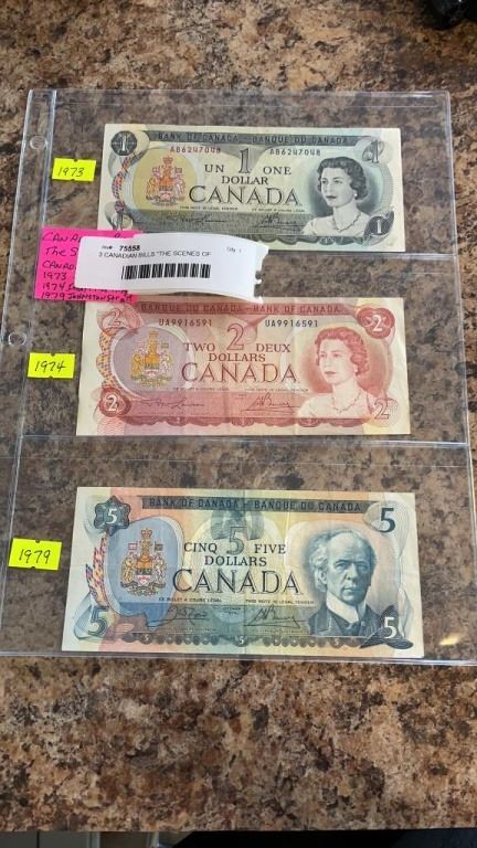 3 CANADIAN BILLS "THE SCENES OF CANADA" SERIES - 1973 PARLIAMENT HILL, 1974 INUIT HUNTING, 1979 JOHN