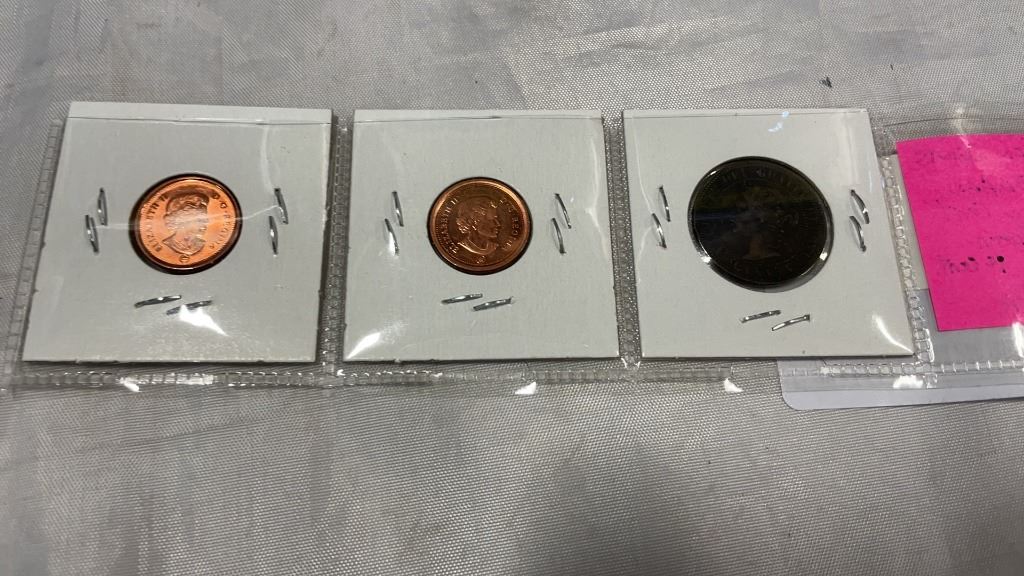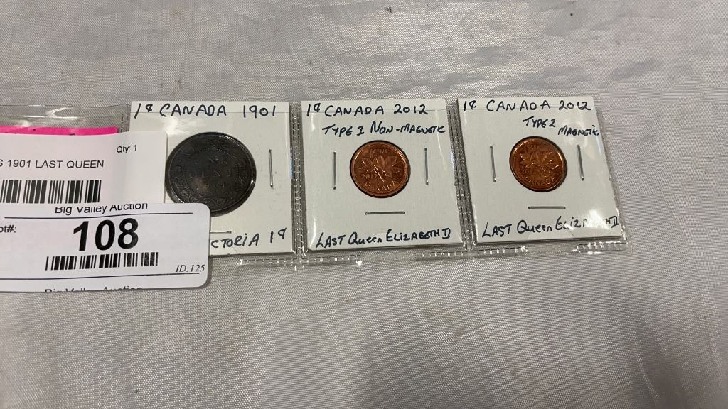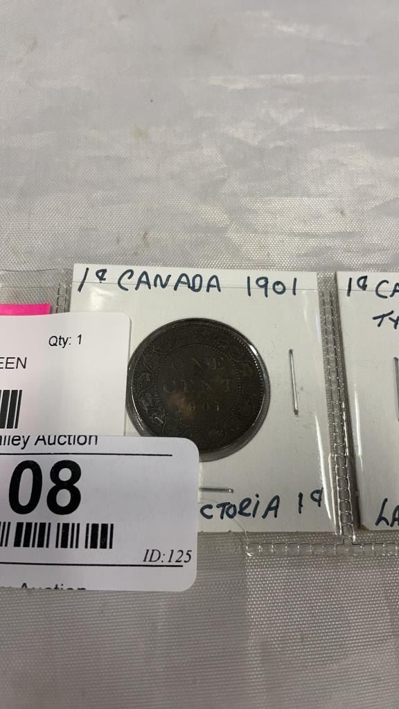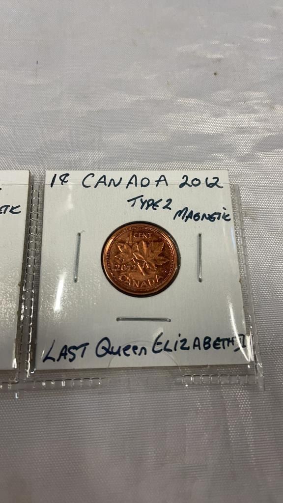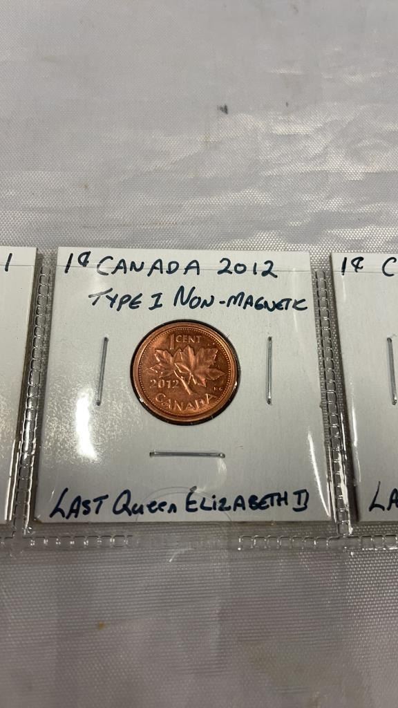 3 CANADIAN CENTS 1901 LAST QUEEN VICTORIA LARGE CENT, 2012 LAST QUEEN ELIZABETH II 1 CENTS MAGNETIC AND NON-MAGNETIC
