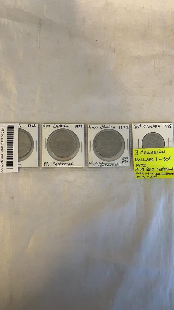 3 CANADIAN DOLLARS PLUS 50 CENT - 1972, 1973 (PEI CENTENNIAL) 1974 (WINNIPEG) 1975 50 CENT
