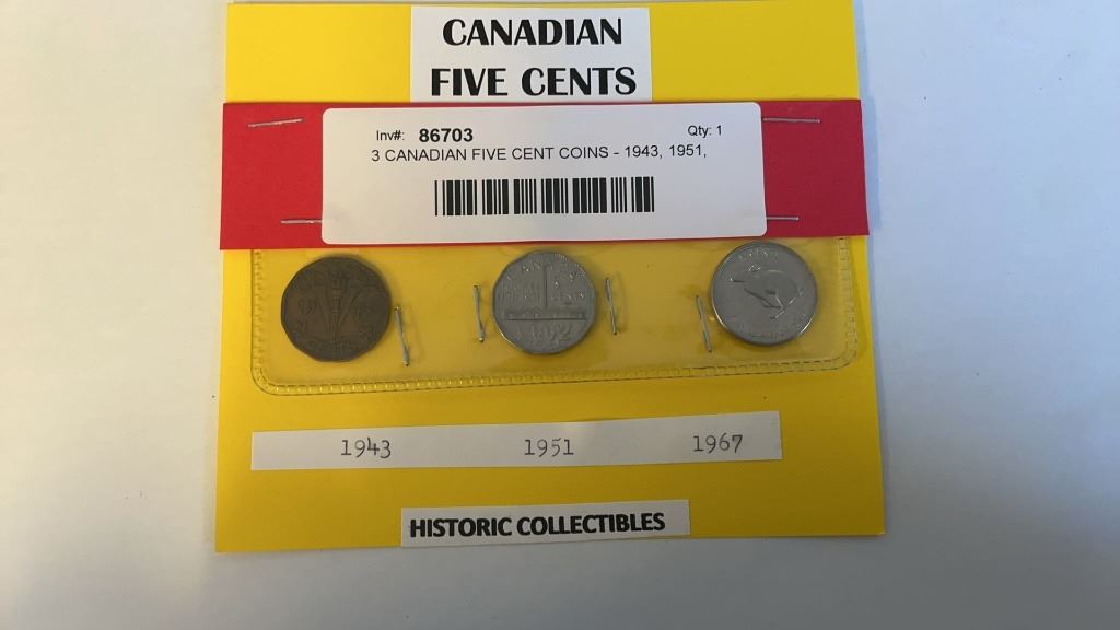 3 CANADIAN FIVE CENT COINS - 1943, 1951, 1967