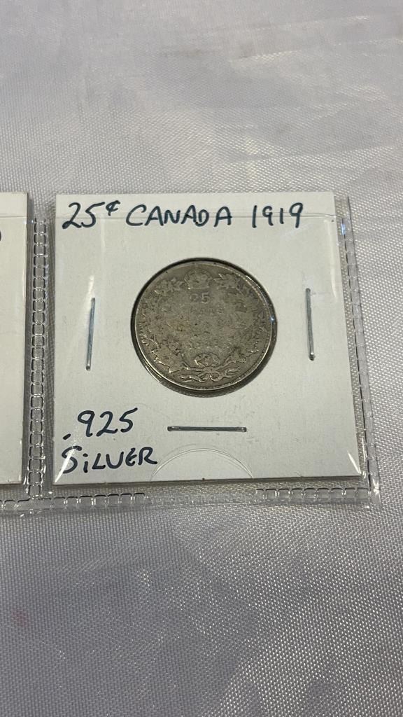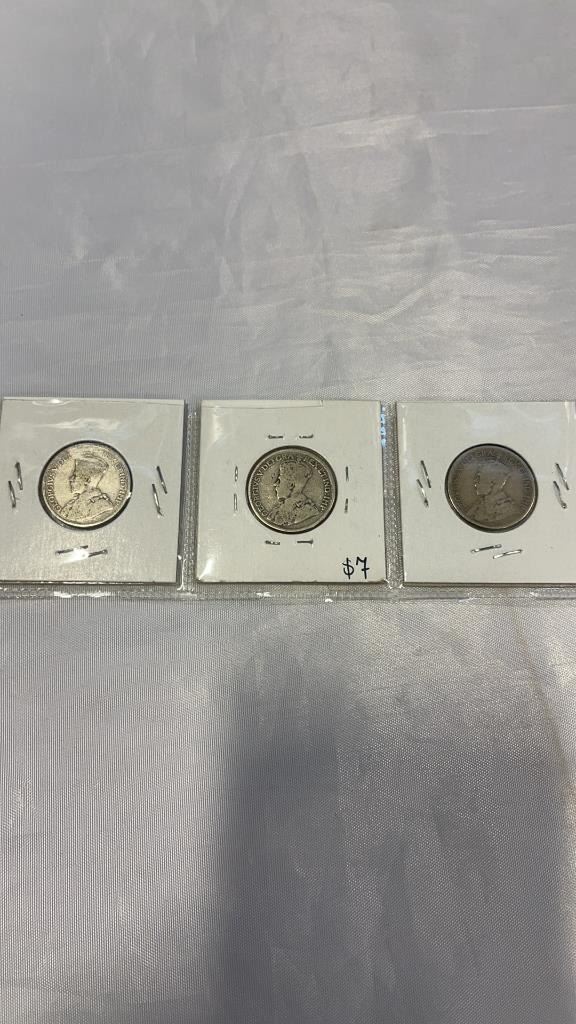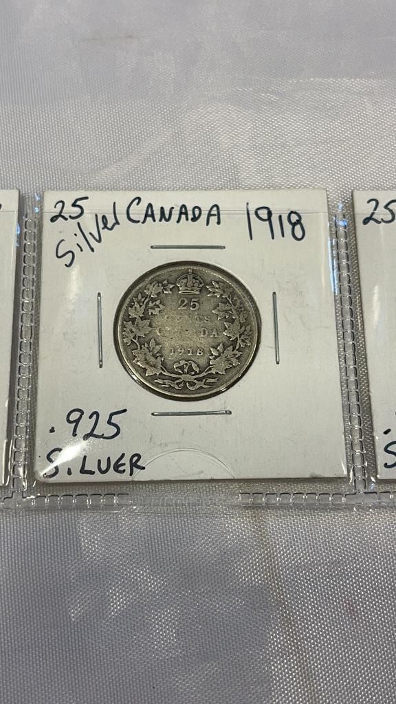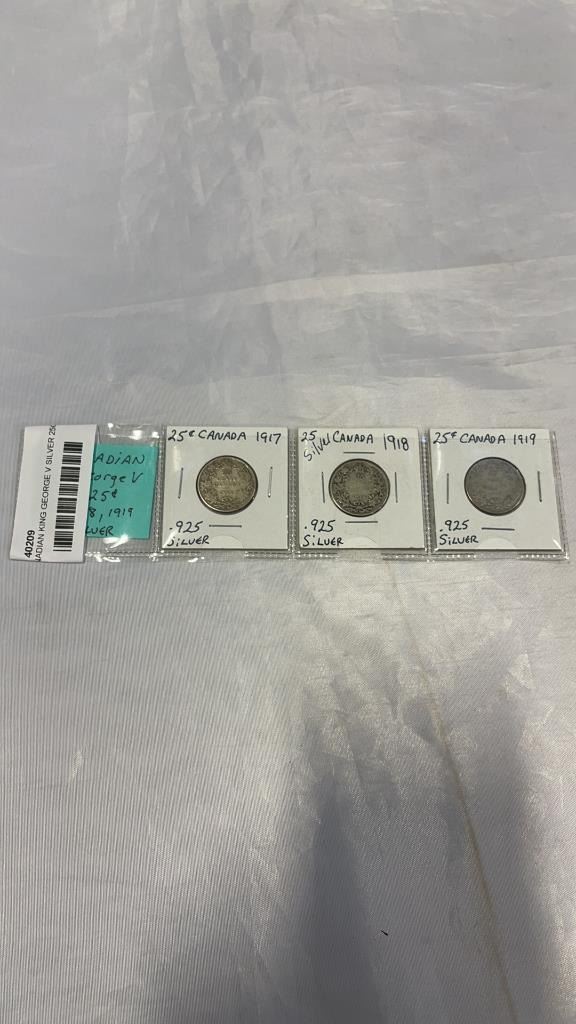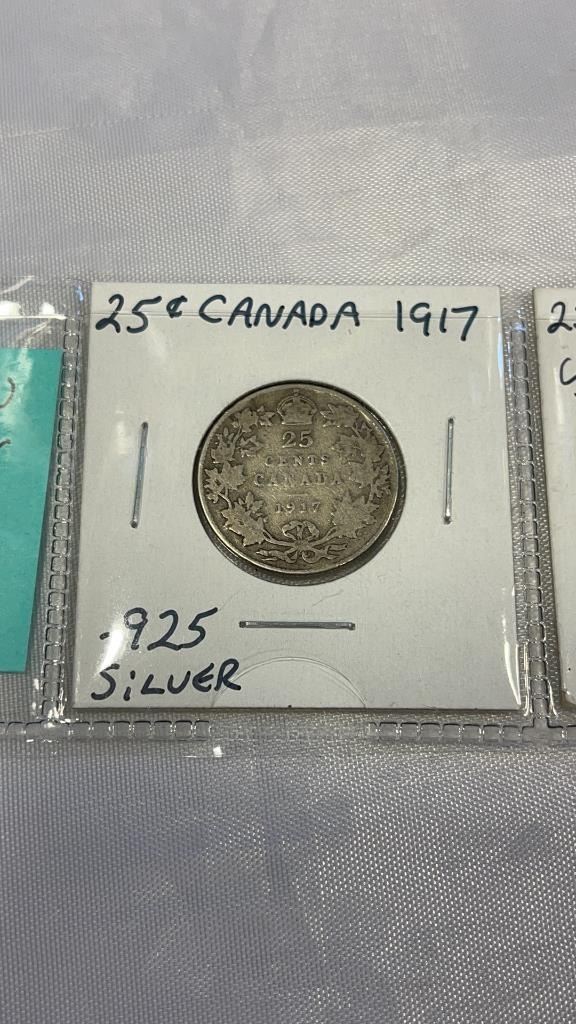 3 CANADIAN KING GEORGE V SILVER 25C 1917, 1918, 1919, .925 SILVER