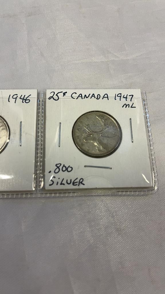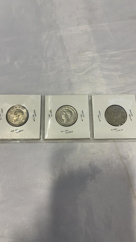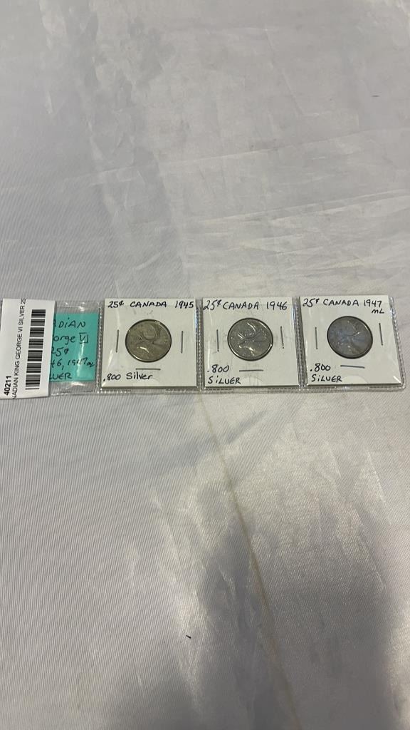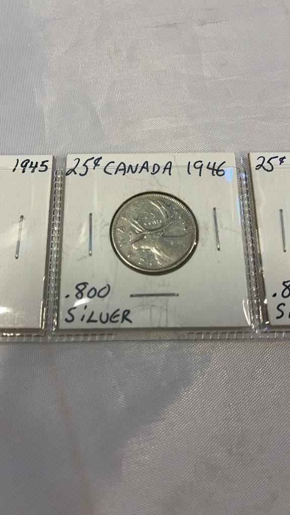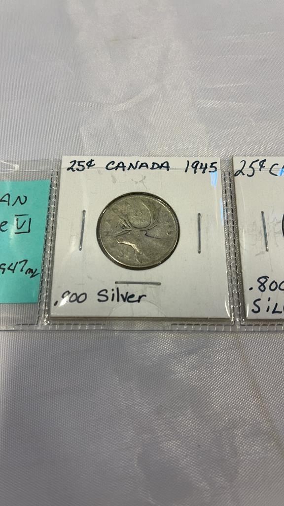 3 CANADIAN KING GEORGE VI SILVER 25C 1945, 1946, 1947 .800 SILVER