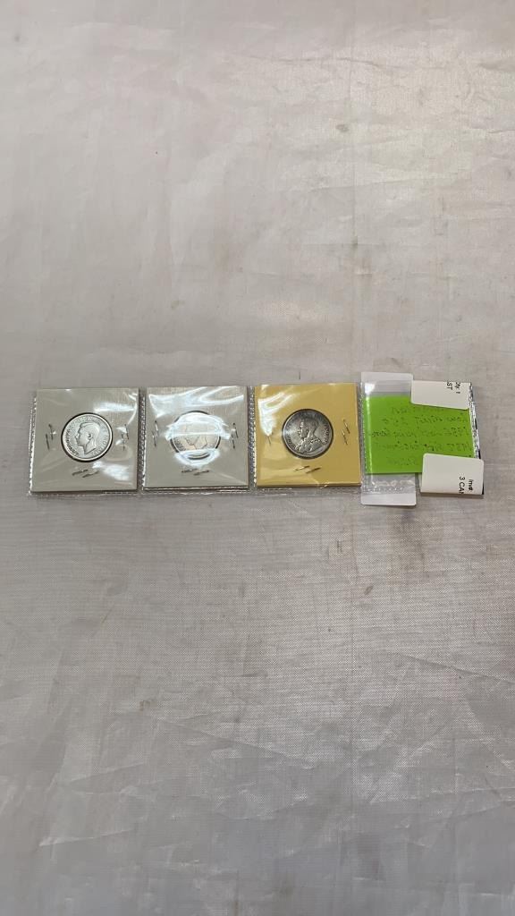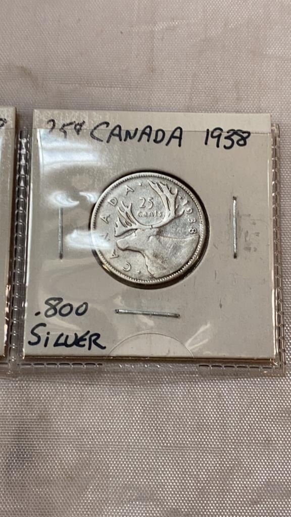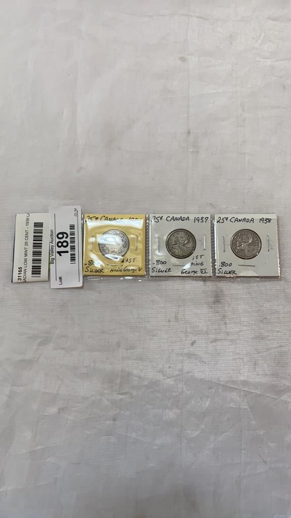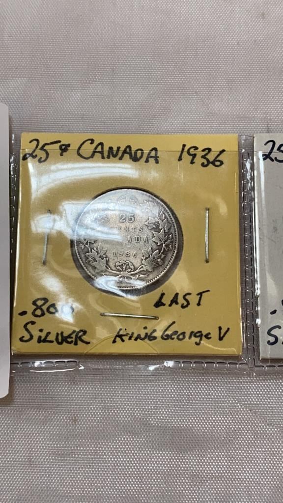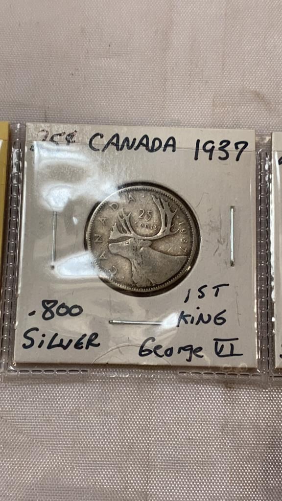 3 CANADIAN LOW MINT 25 CENT - 1936 LAST KING GEORGE V, 1937 FIRST KING GEORGE VI, AND 1938 .800 SILV