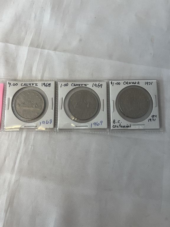 3 CANADIAN NEWER DOLLARS 1968, 1969, 1971 (BC CENTENNIAL)