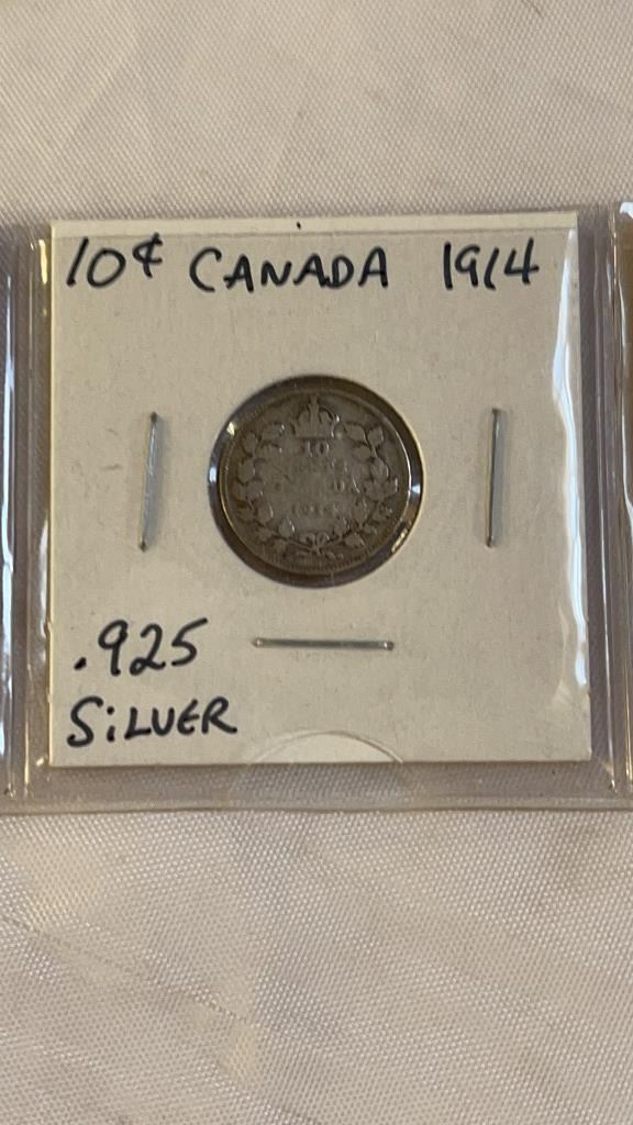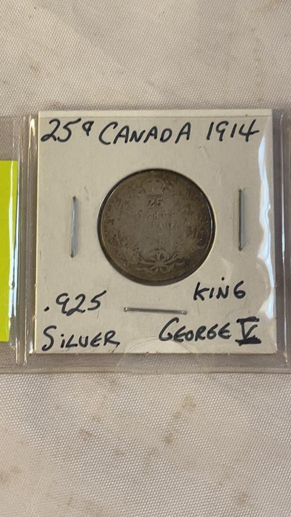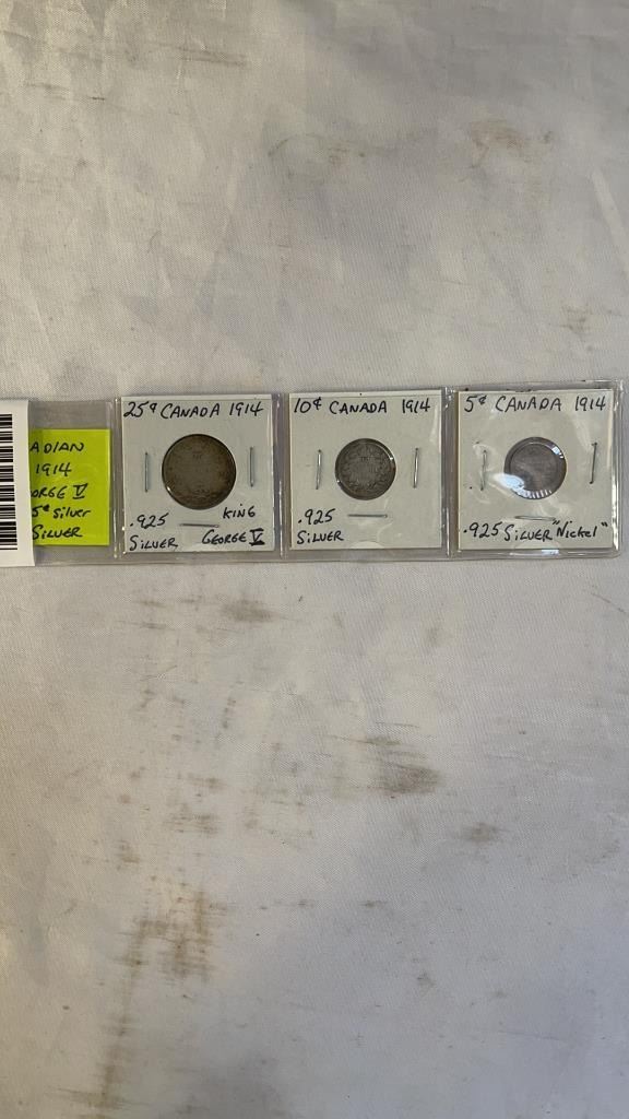 3 CANADIAN SILVER 1914 KING GEORGE V 25 CENT, 10 CENT, AND 5 CENT - ALL .925 SILVER