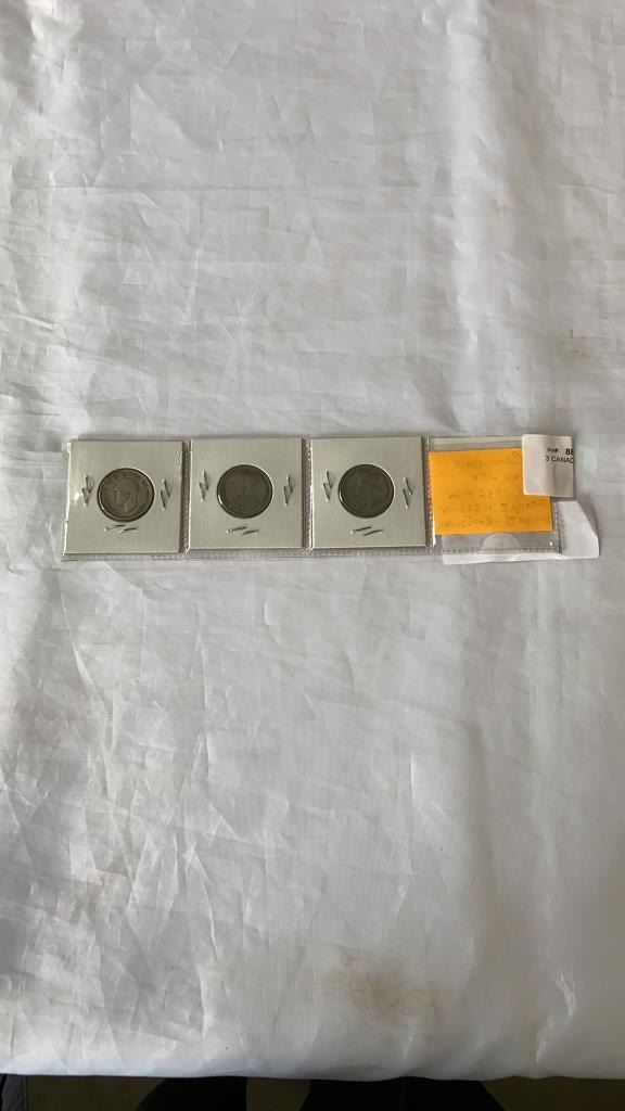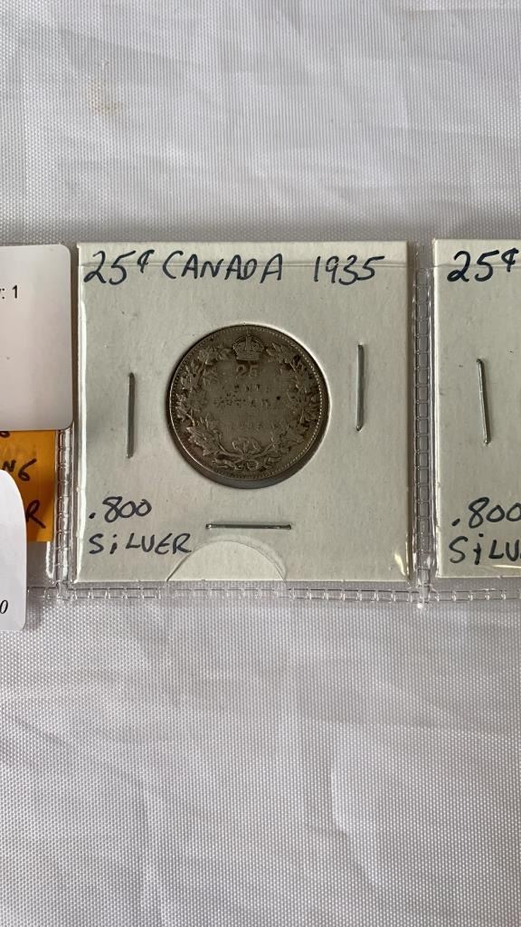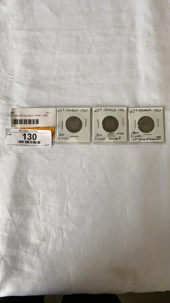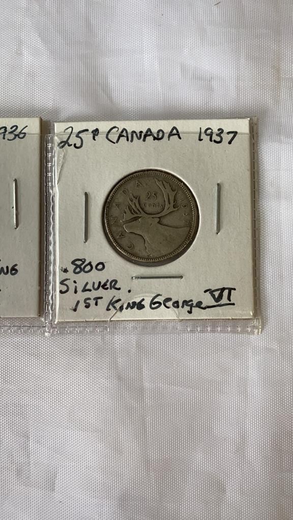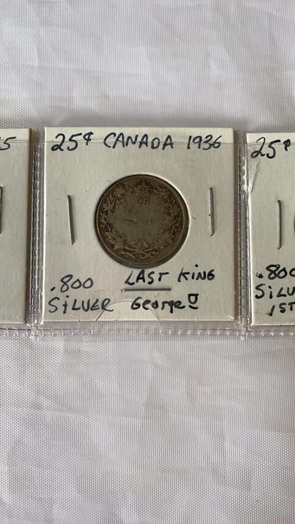 3 CANADIAN SILVER 25 CENT COINS - 1935, 1936, 1937 .800 SILVER