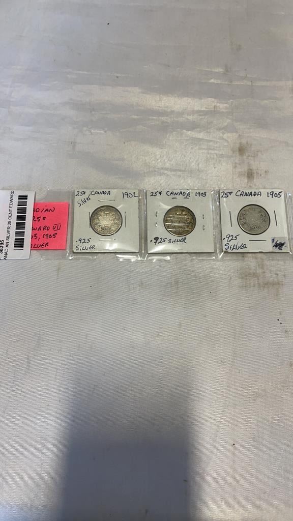 3 CANADIAN SILVER 25 CENT EDWARD VII 1902, 1903, 1905 .925 SILVER