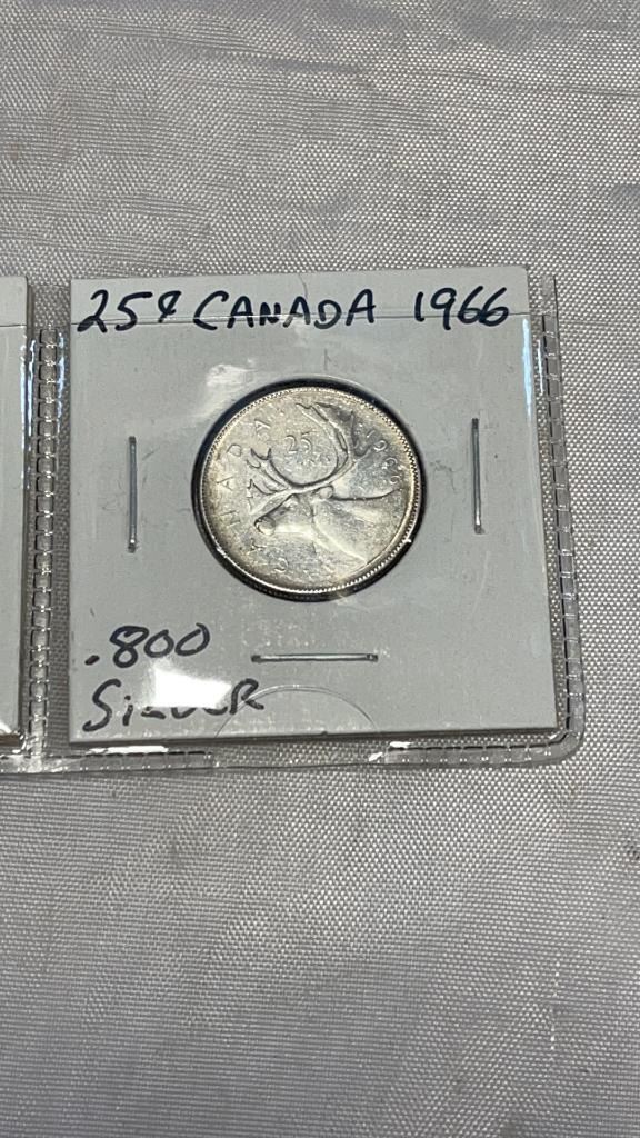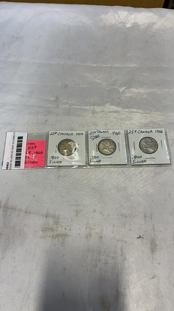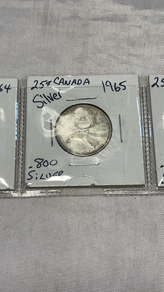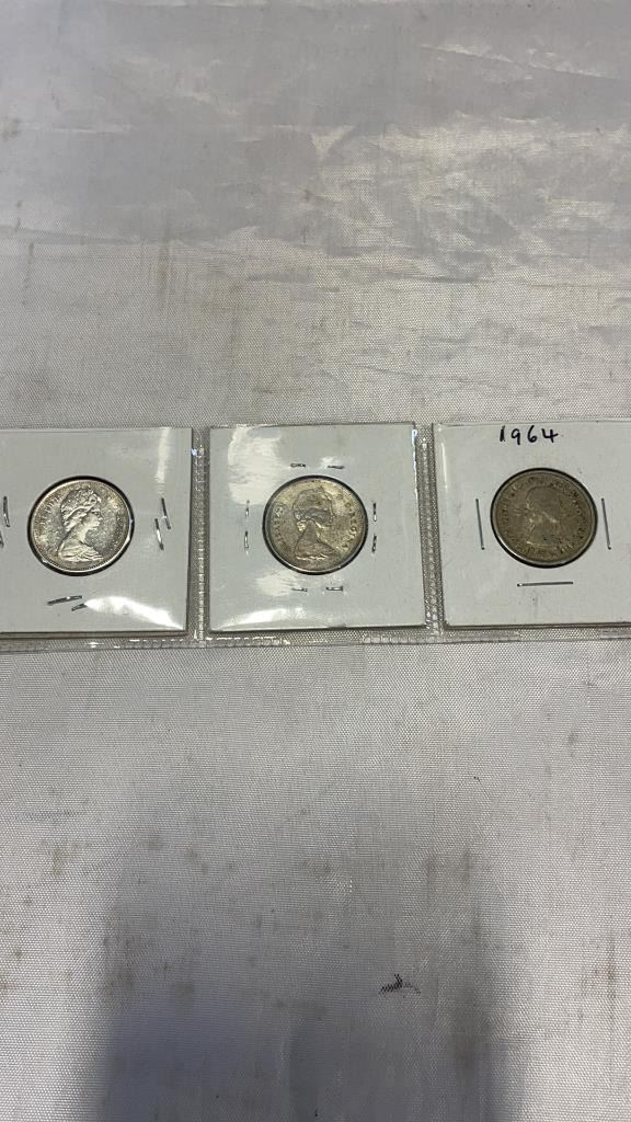 3 CANADIAN SILVER 25 CENT ELIZABETH II 1964-1966 .800 SILVER