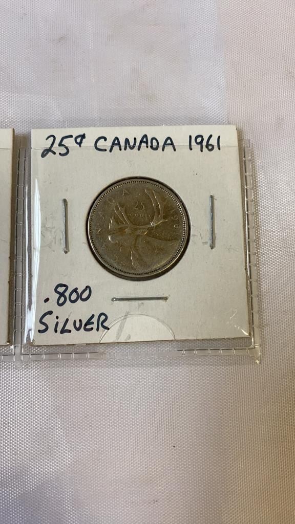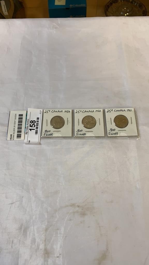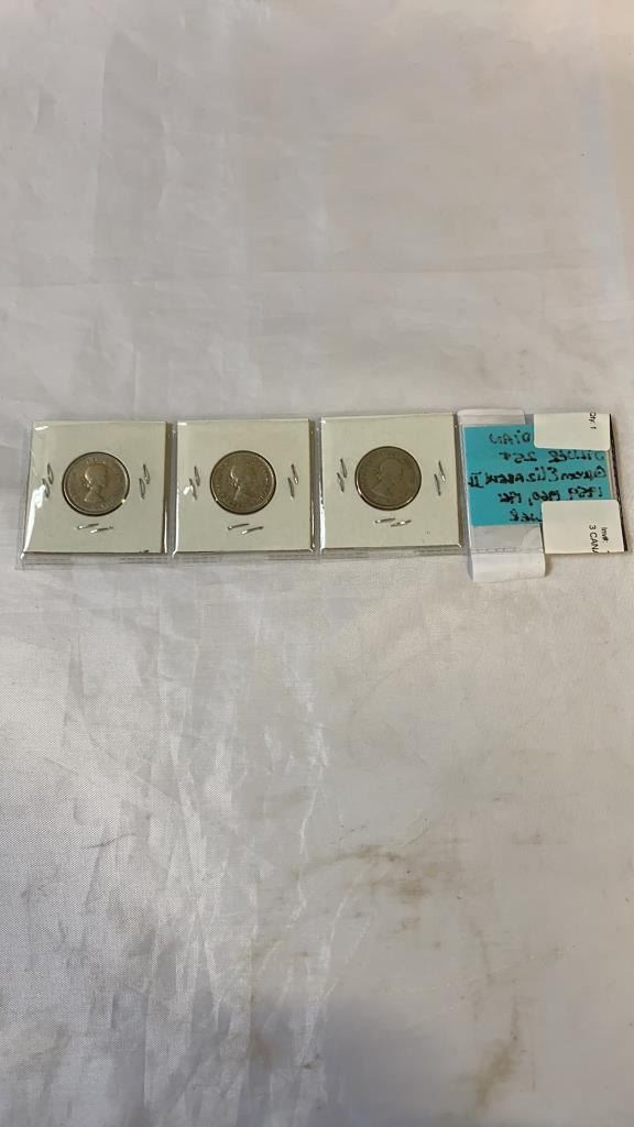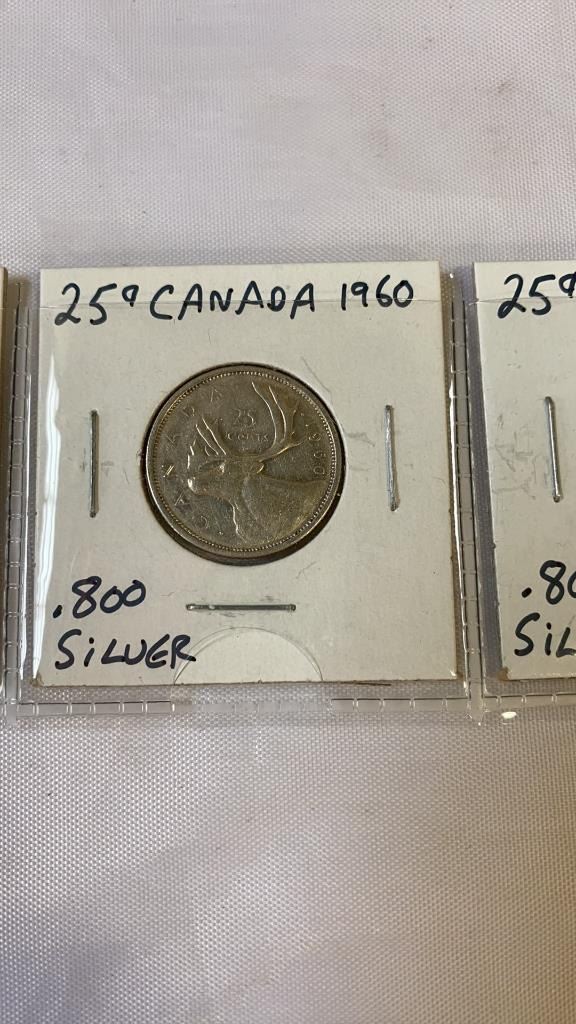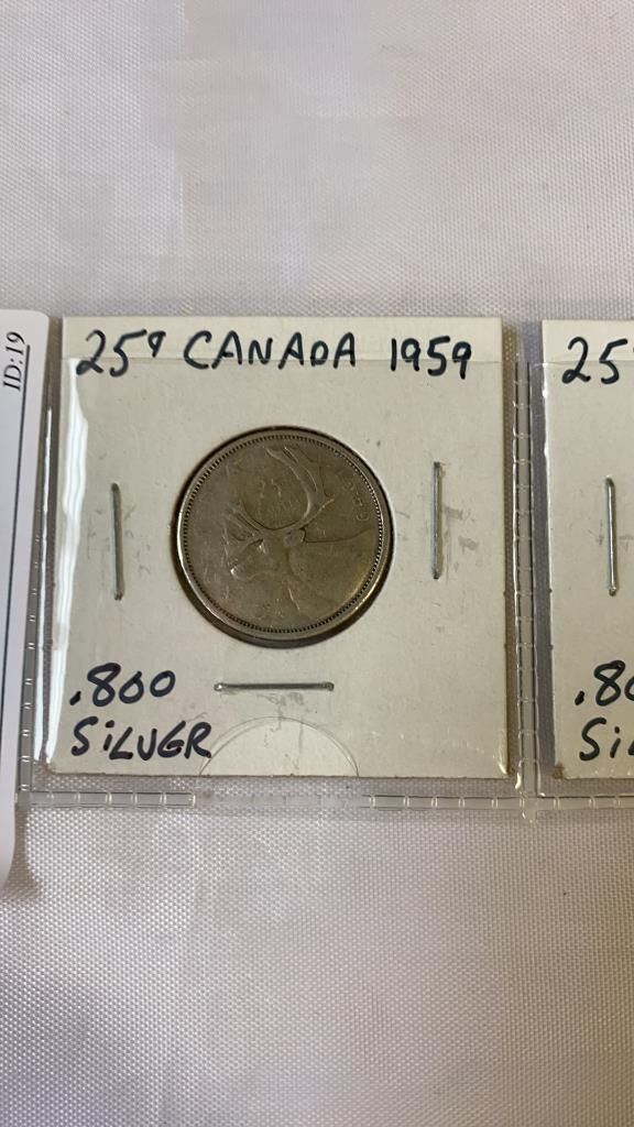 3 CANADIAN SILVER 25 CENT QUEEN ELIZABETH II 1959-1961 .800 SILVER