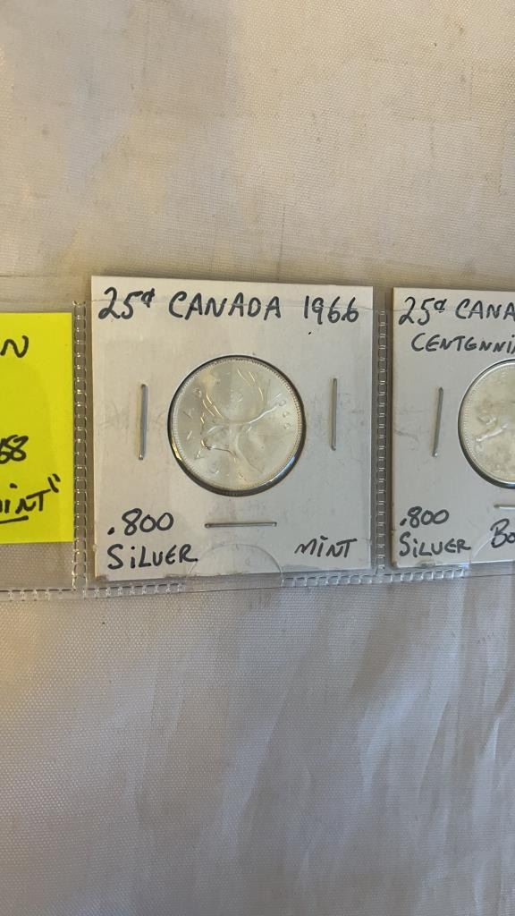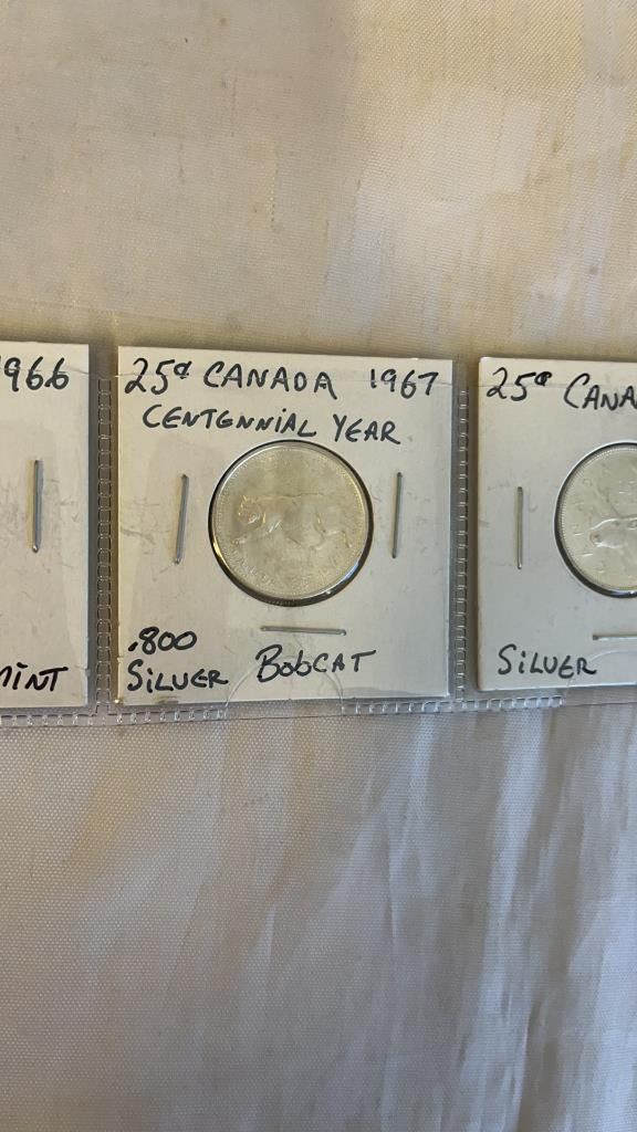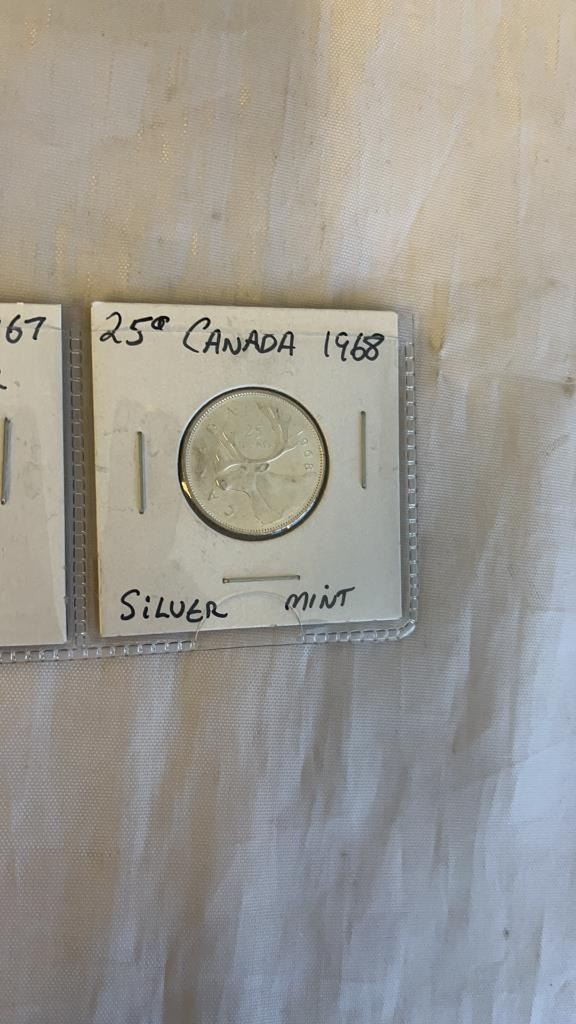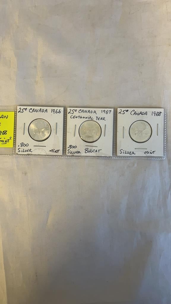 3 CANADIAN SILVER (.800) 25 CENT - 1966, 1967, 1968 - MINT CONDITION