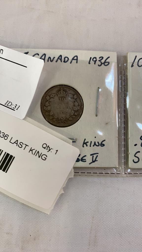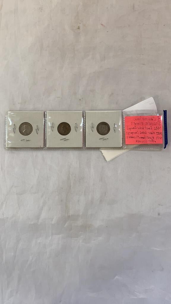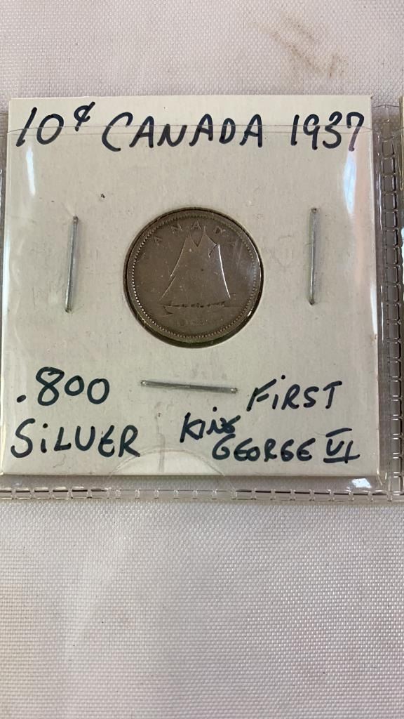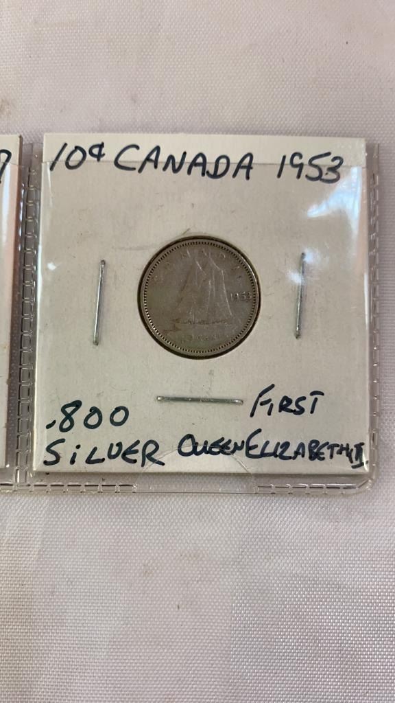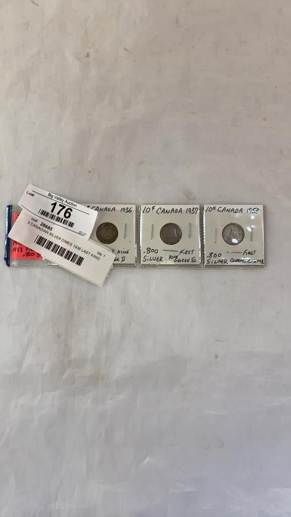 3 CANADIAN SILVER DIMES 1936 LAST KING GEORGE V, 1937 FIRST KING GEORGE VI, 1953 FIRST QUEEN ELIZABETH II .800 SILVER