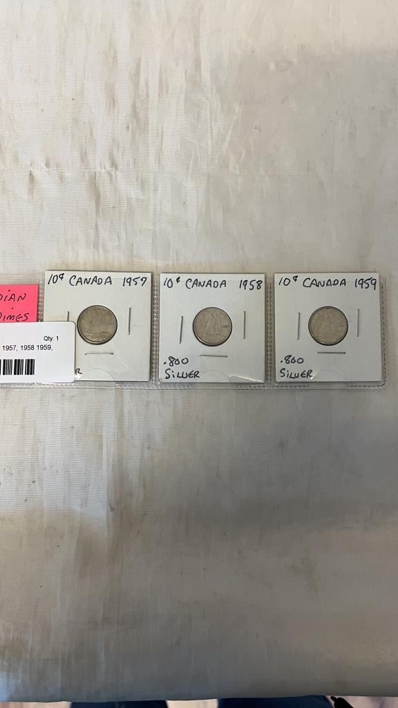 3 CANADIAN SILVER DIMES 1957, 1958 1959, .800 SILVER