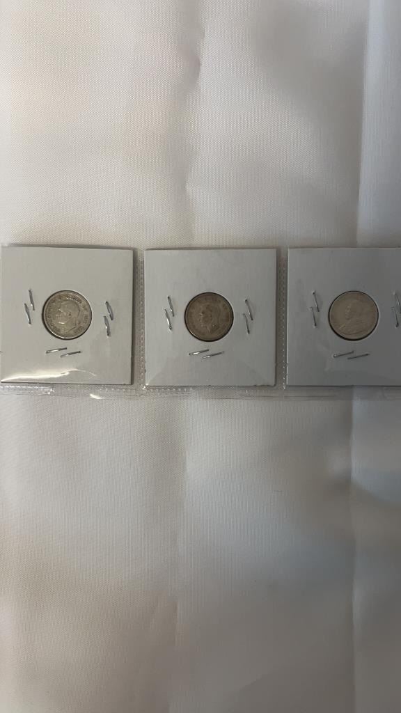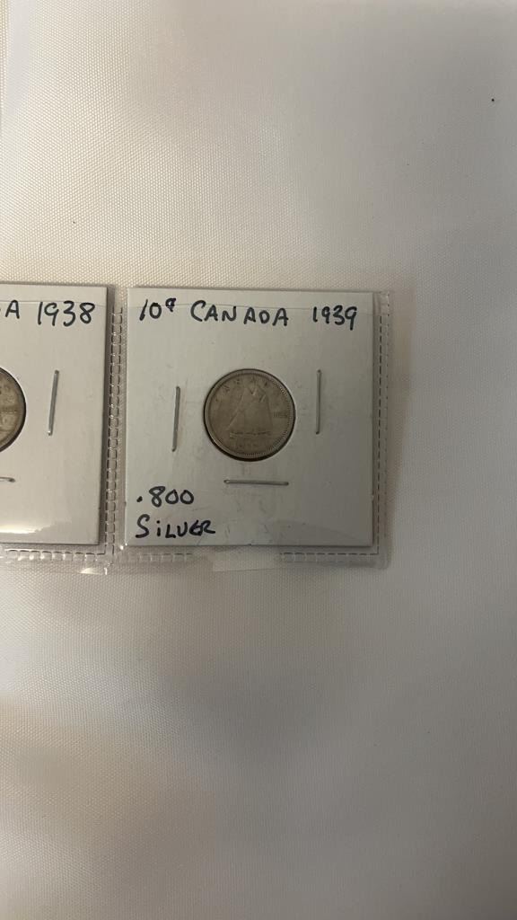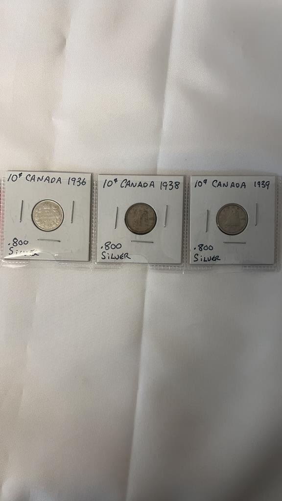 3 CANADIAN SILVER DIMES - EARLY WWII COINS 1936, 1938, 1939 .800 SILVER