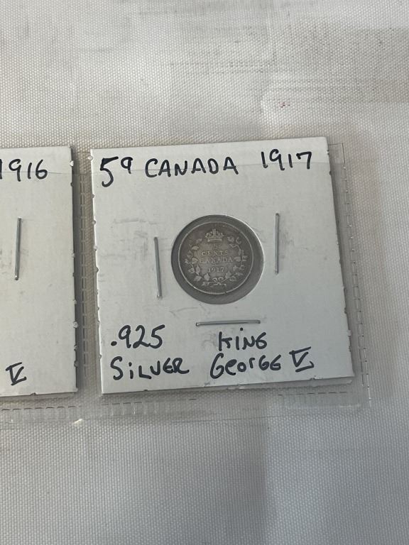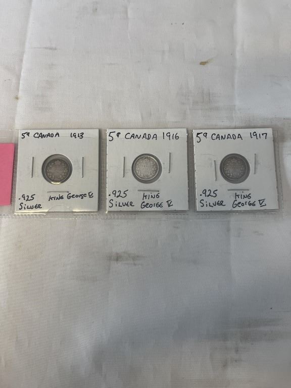 3 CANADIAN SILVER SMALL 5 CENTS 1913, 1916, 1917 .925