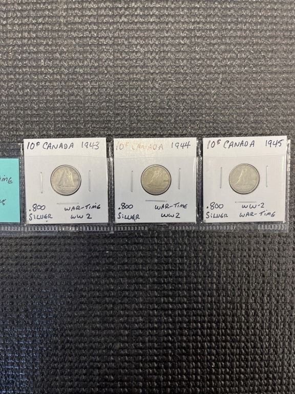 3 CANADIAN SILVER WAR TIME WW2 DIMES 1943, 1944, 1945 .800 SILVER