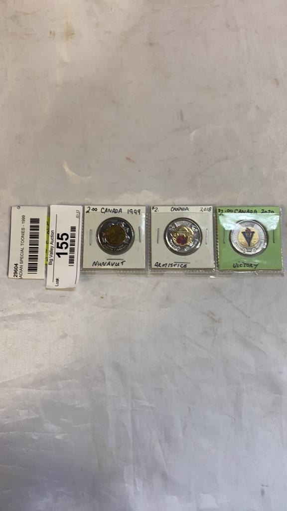 3 CANADIAN SPECIAL TOONIES - 1999 NUNAVUT, 2018 ARMISTICE, 2020 VICTORY