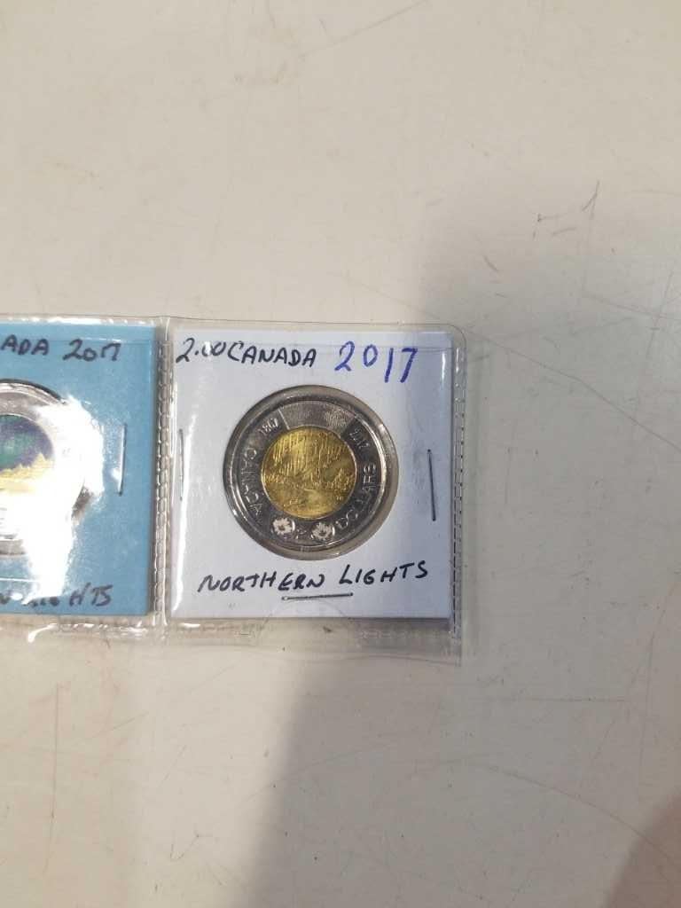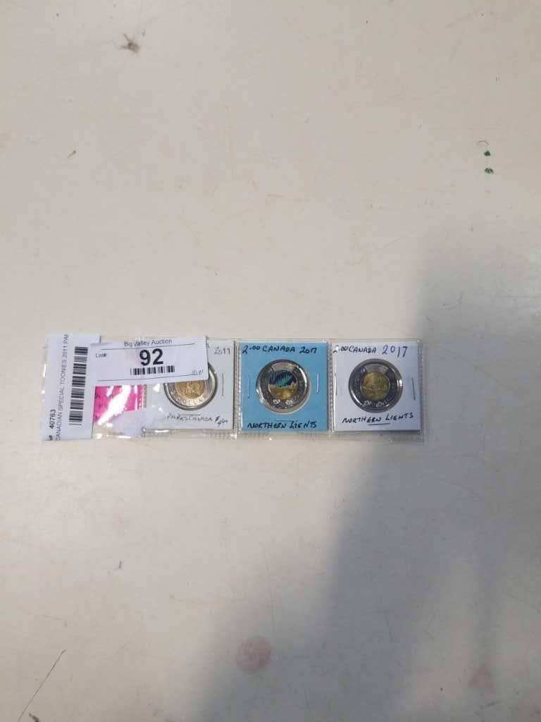 3 CANADIAN SPECIAL TOONIES 2011 PARKS, CANADA 2017 COLOURED, AND PLAIN NORTHERN LIGHTS