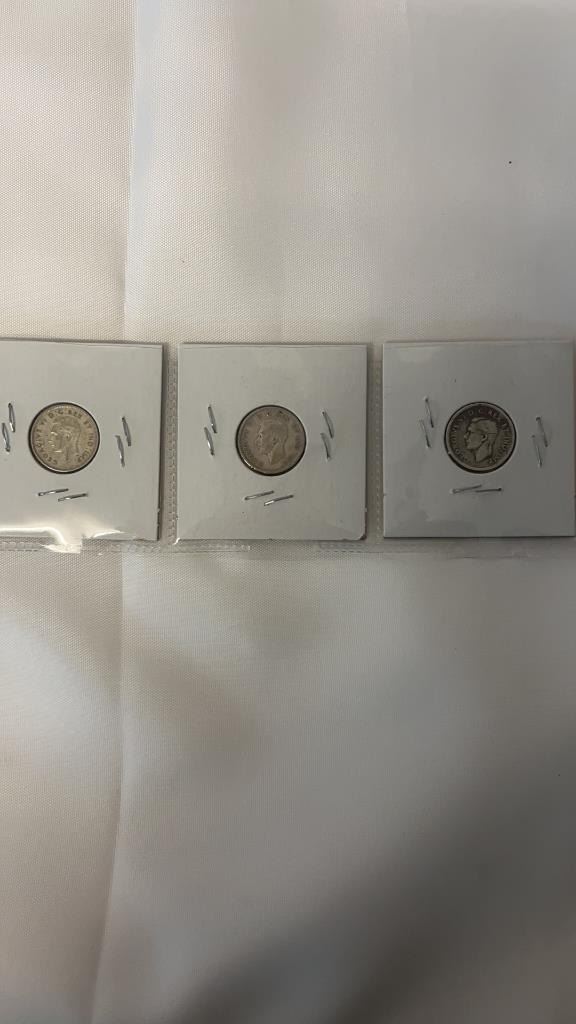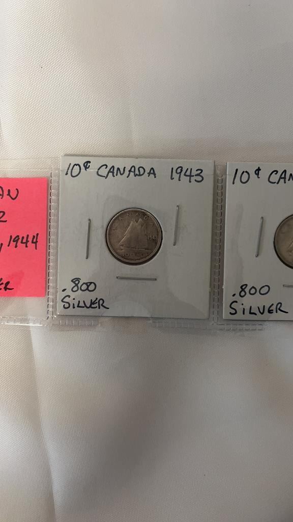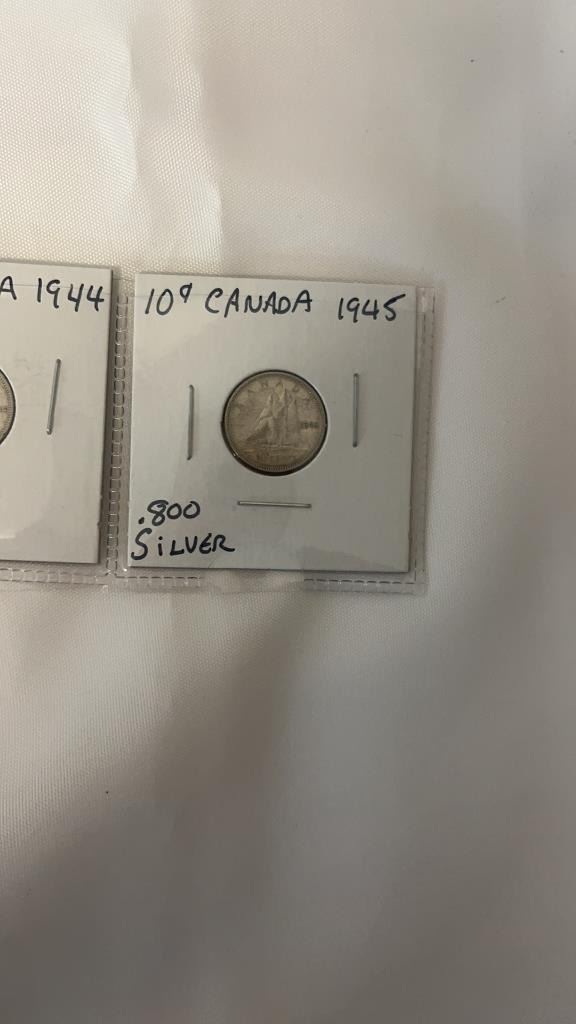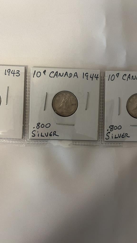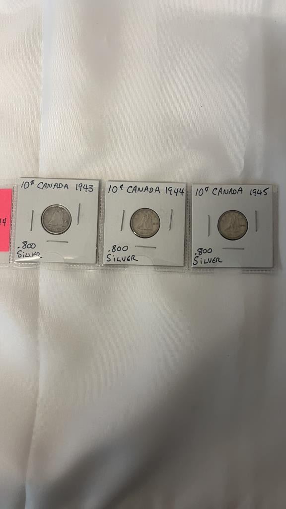 3 CANADIAN WWII DIMES - 1943, 1944, 1945 .800 SILVER