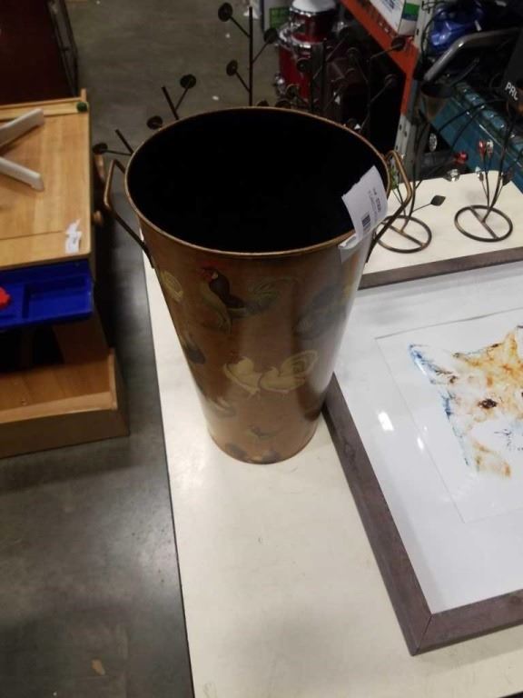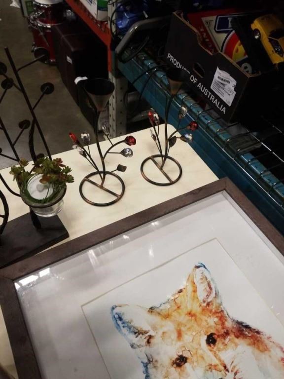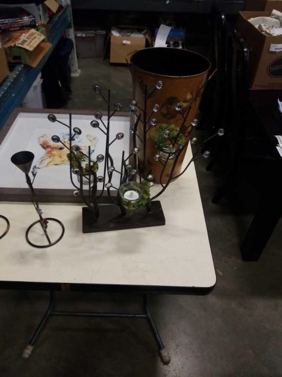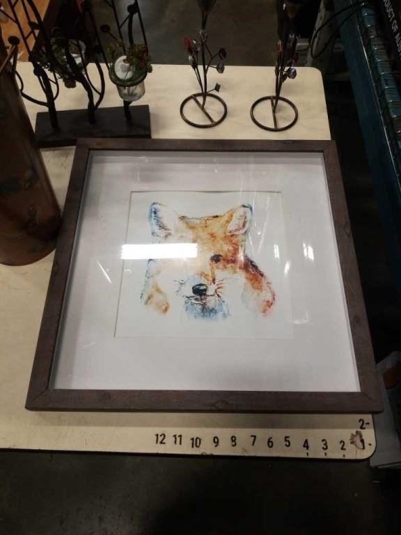 3 CANDLE HOLDERS, METAL BUCKET AND FOX PRINT