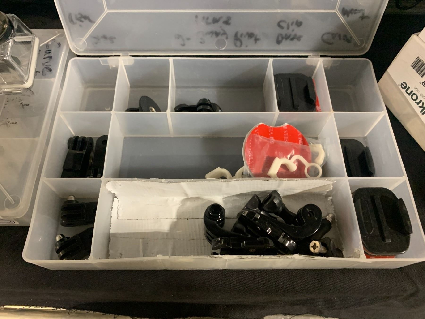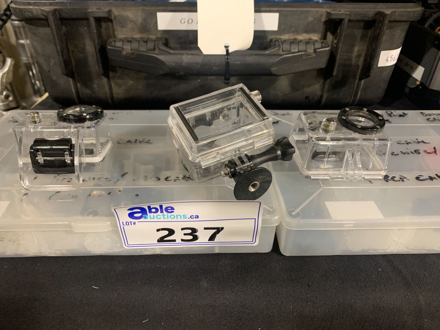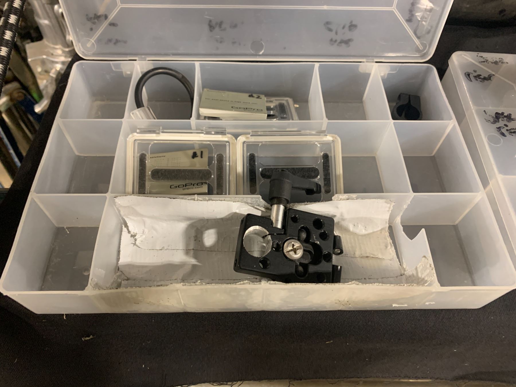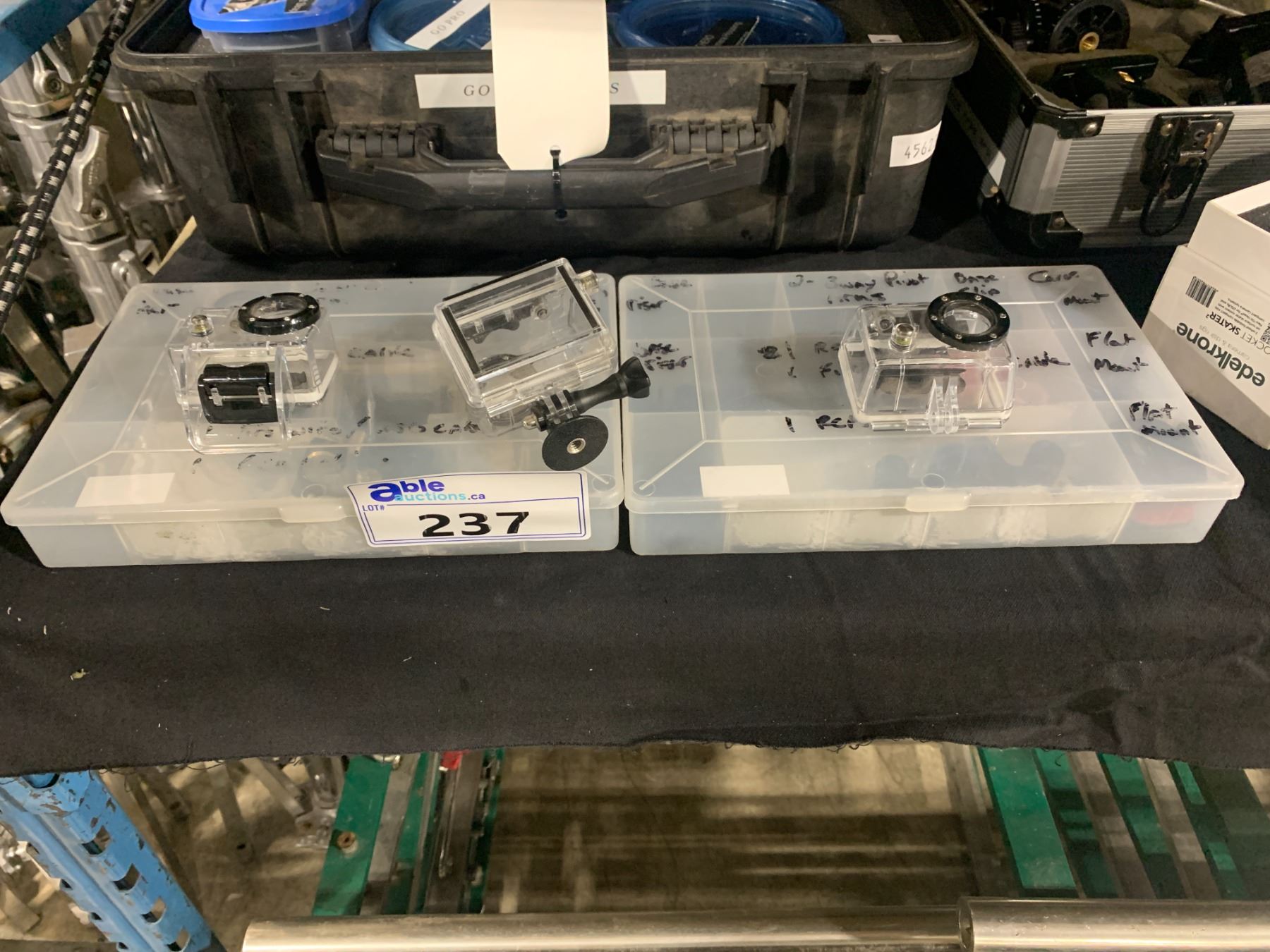 3 COMMERCIAL PRODUCTION GO PRO PROTECTIVE CASES & 2 PLASTIC SORTERS OF VARIOUS CLIPS, PARTS, HARDWARE, & ACCESSORIES