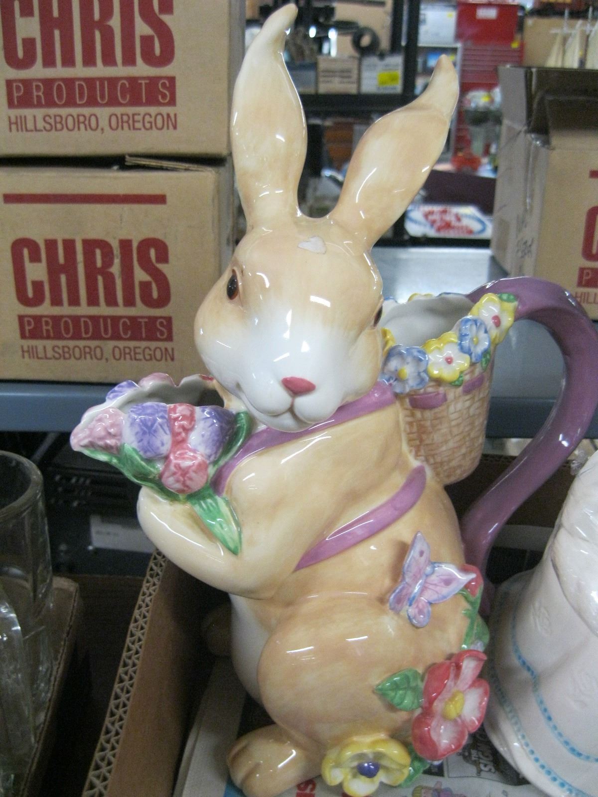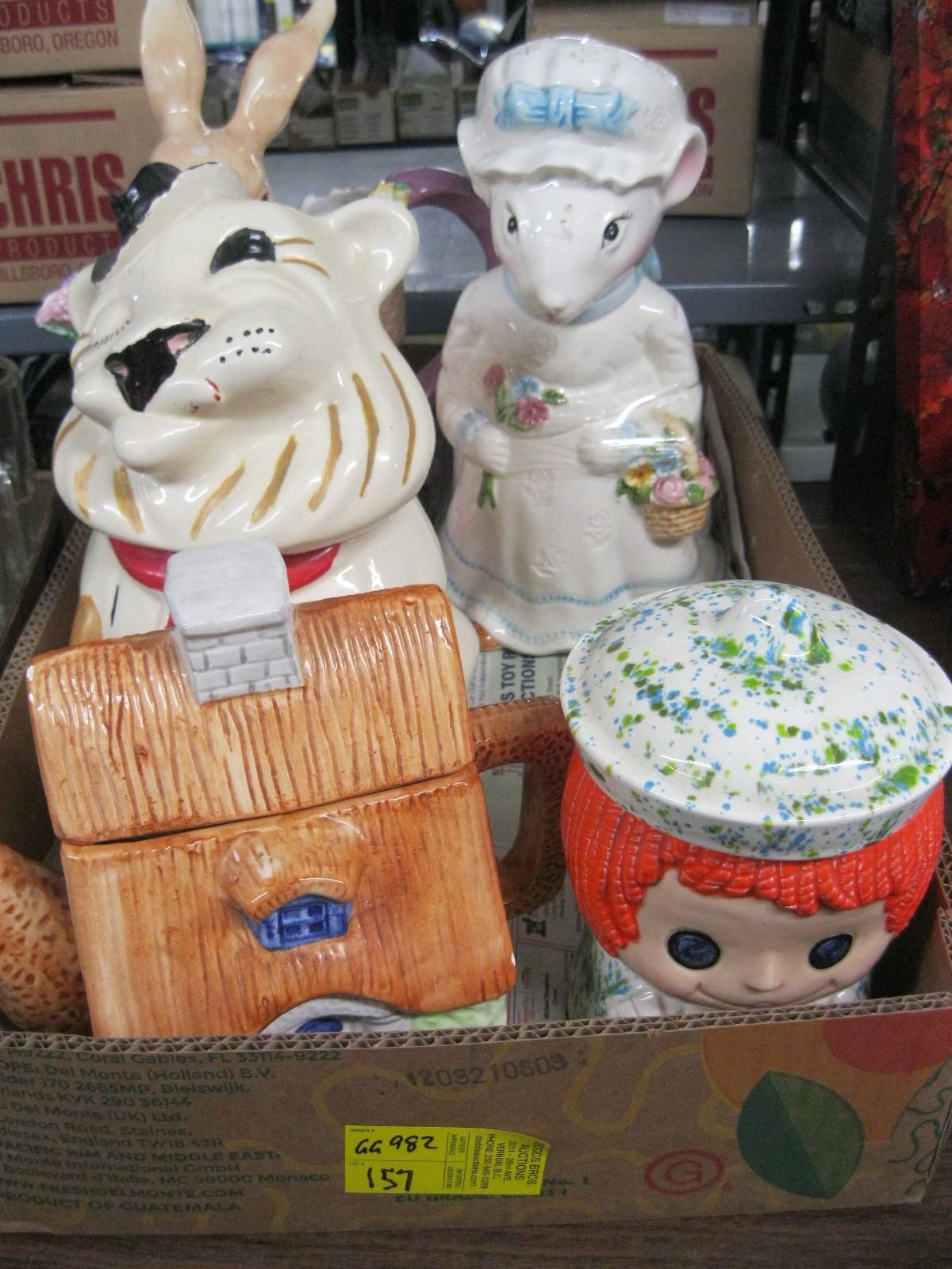 3 COOKIE JARS, A DECORATIVE TEAPOT & RABBIT PITCHER
