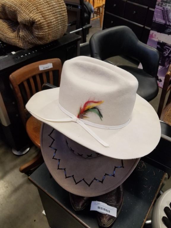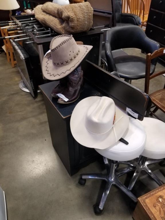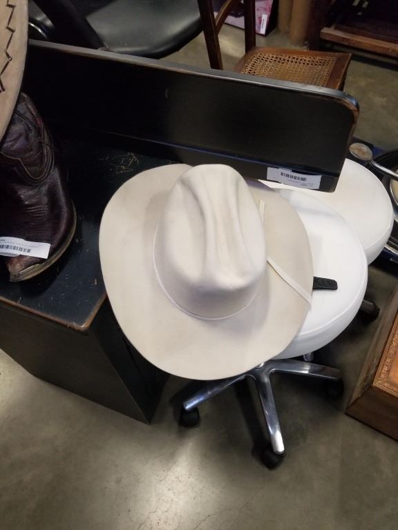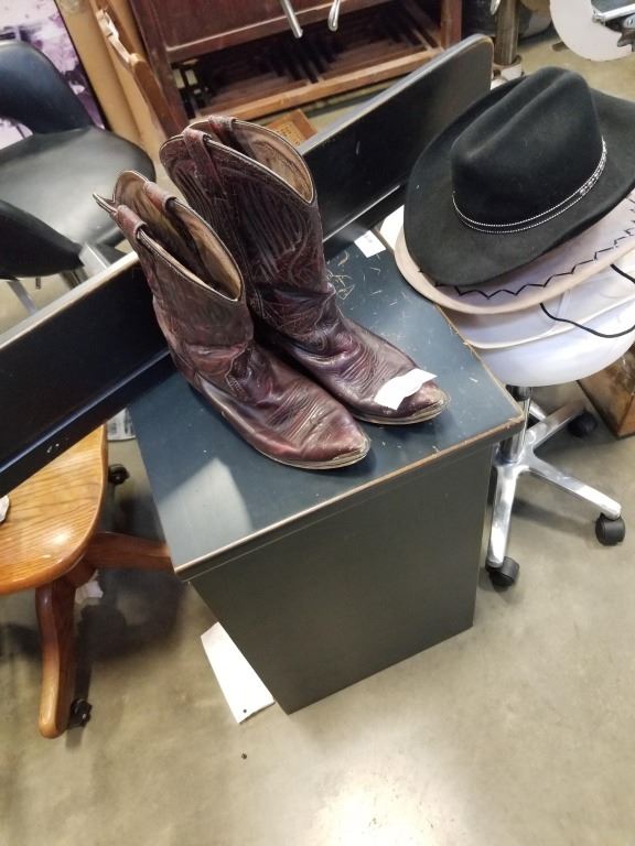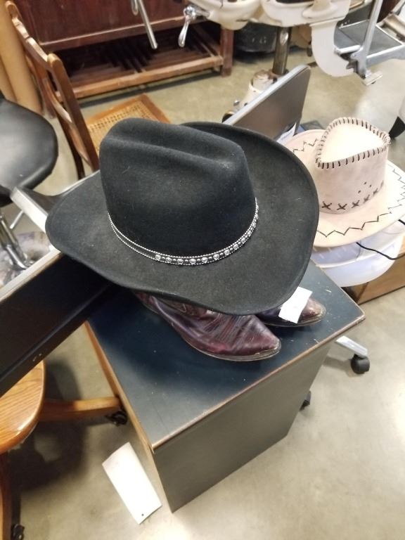 3 COWBOY HATS AND SIZE 8 1/2 COWBOY BOOTS