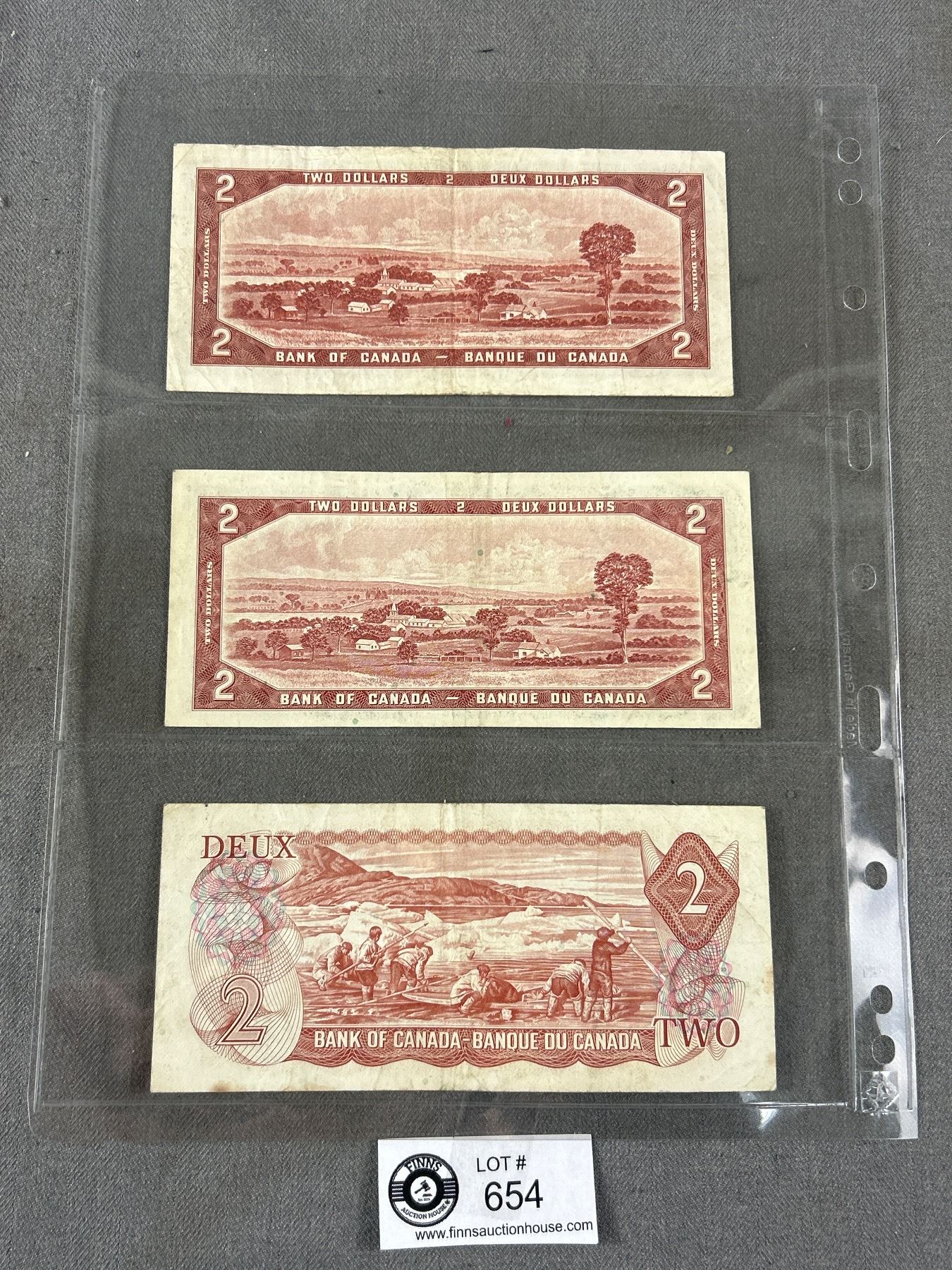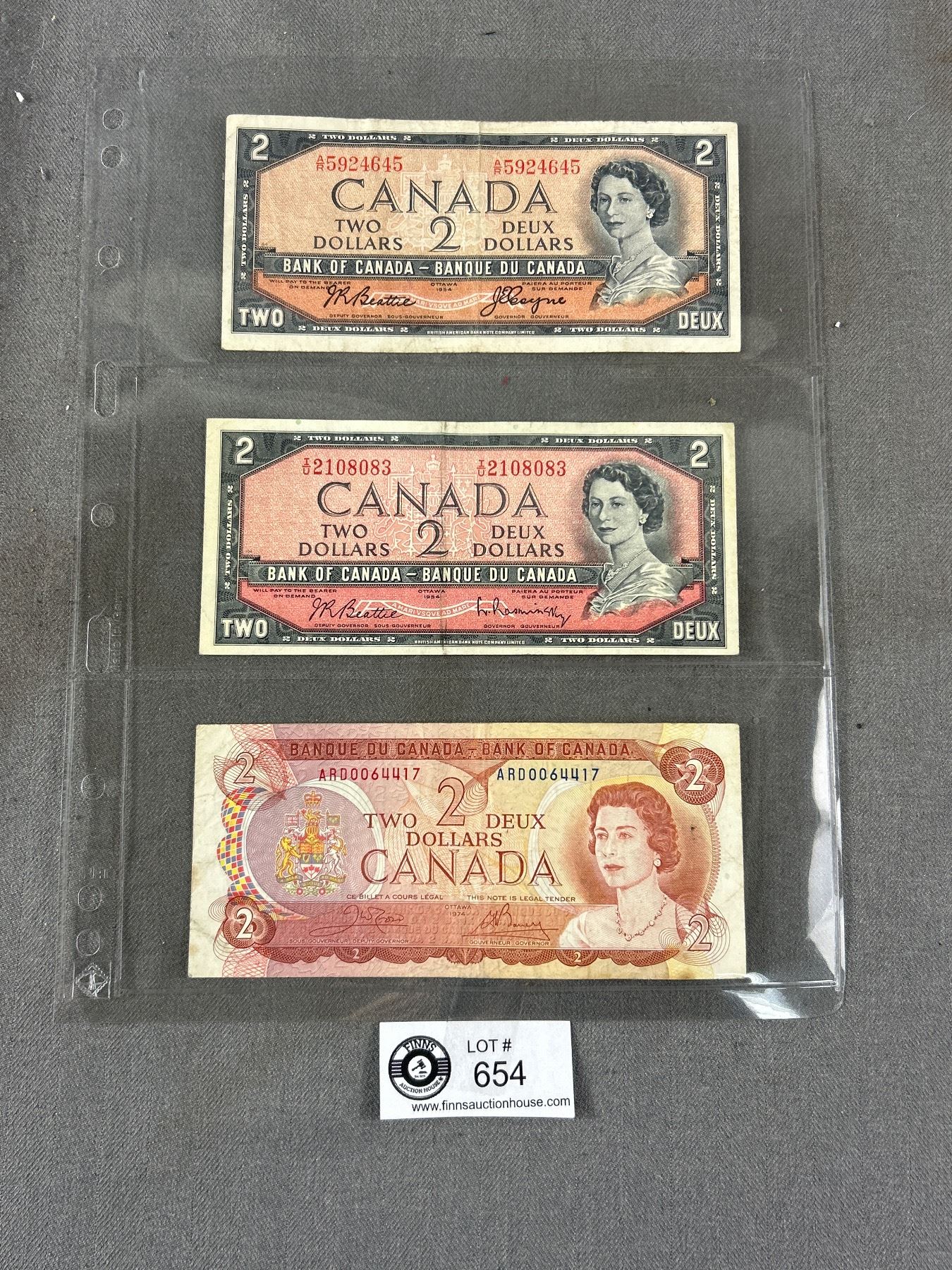 3 Canadian $2 Paper Bills - (2) 1954 & (1) 1974. In Protective Sleeve