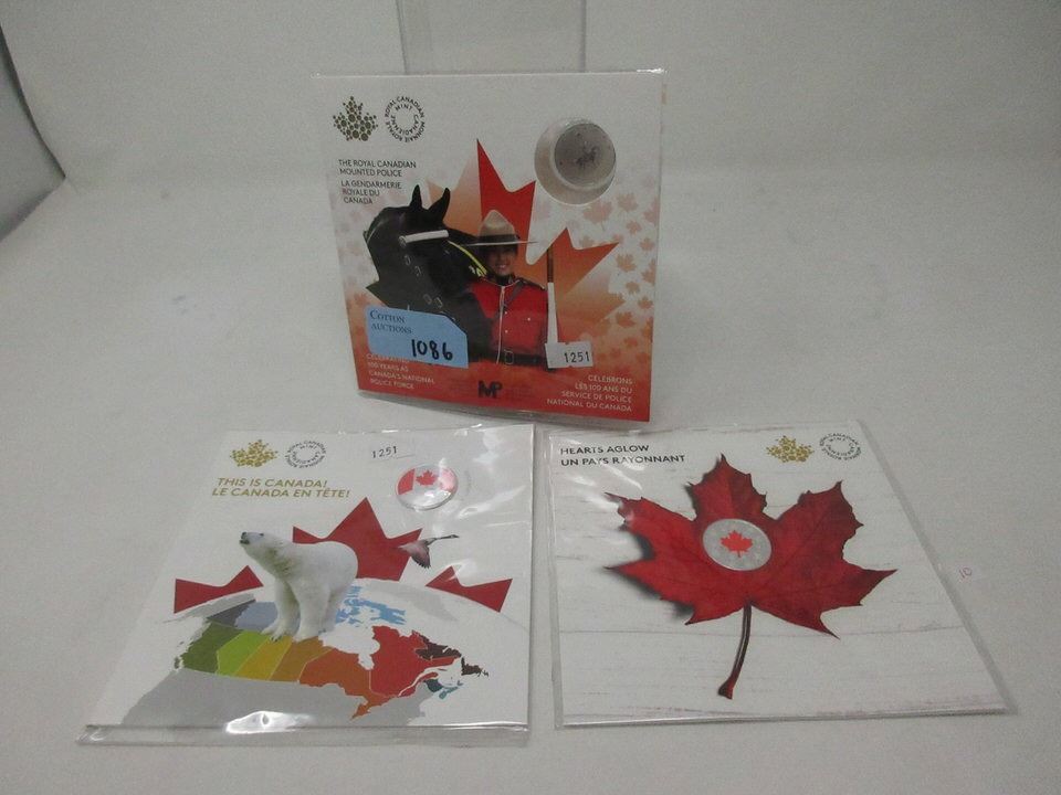 7.96 Grams each. 2018 "Hearts Aglow", 2019 "RCMP", and 2019 "This is Canada". All are mint sealed in folders. Tax exempt.