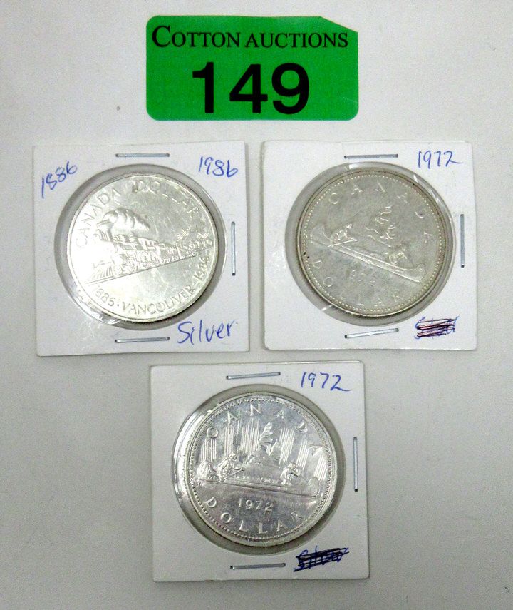 One 1986 150th Anniversary of Toronto commemorative coin and two 1972 silver voyageur coins.