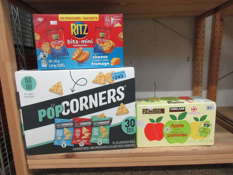 Case of 30 Ritz Bits, Pop Corners 30 x 28 g snack crackers, and case of 24 Kirkland squeeze apple pouches. Earliest BB: Oct 2024.
