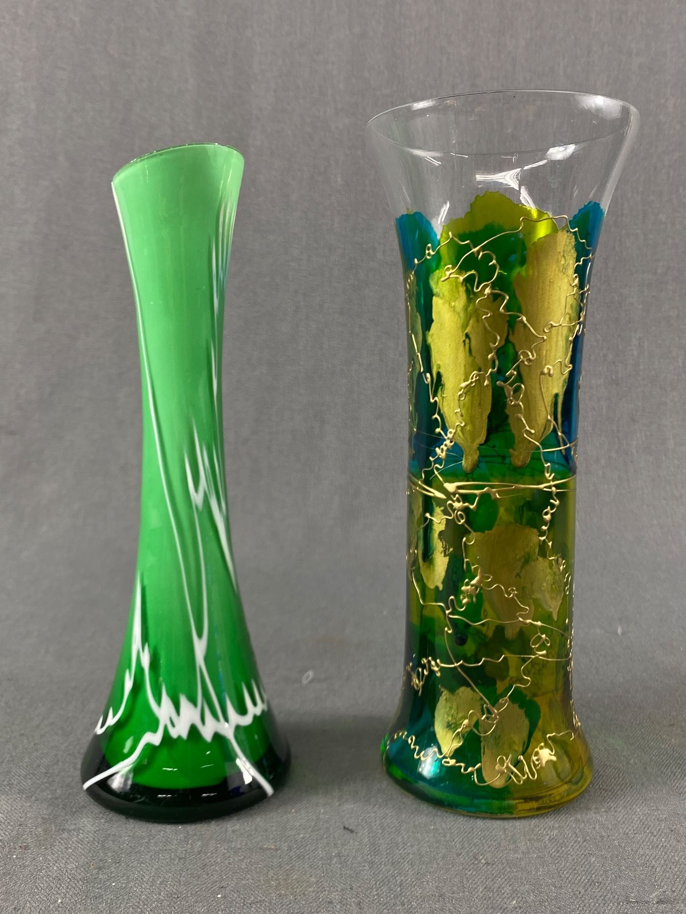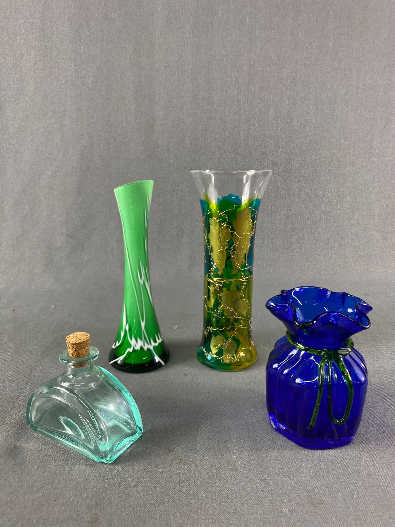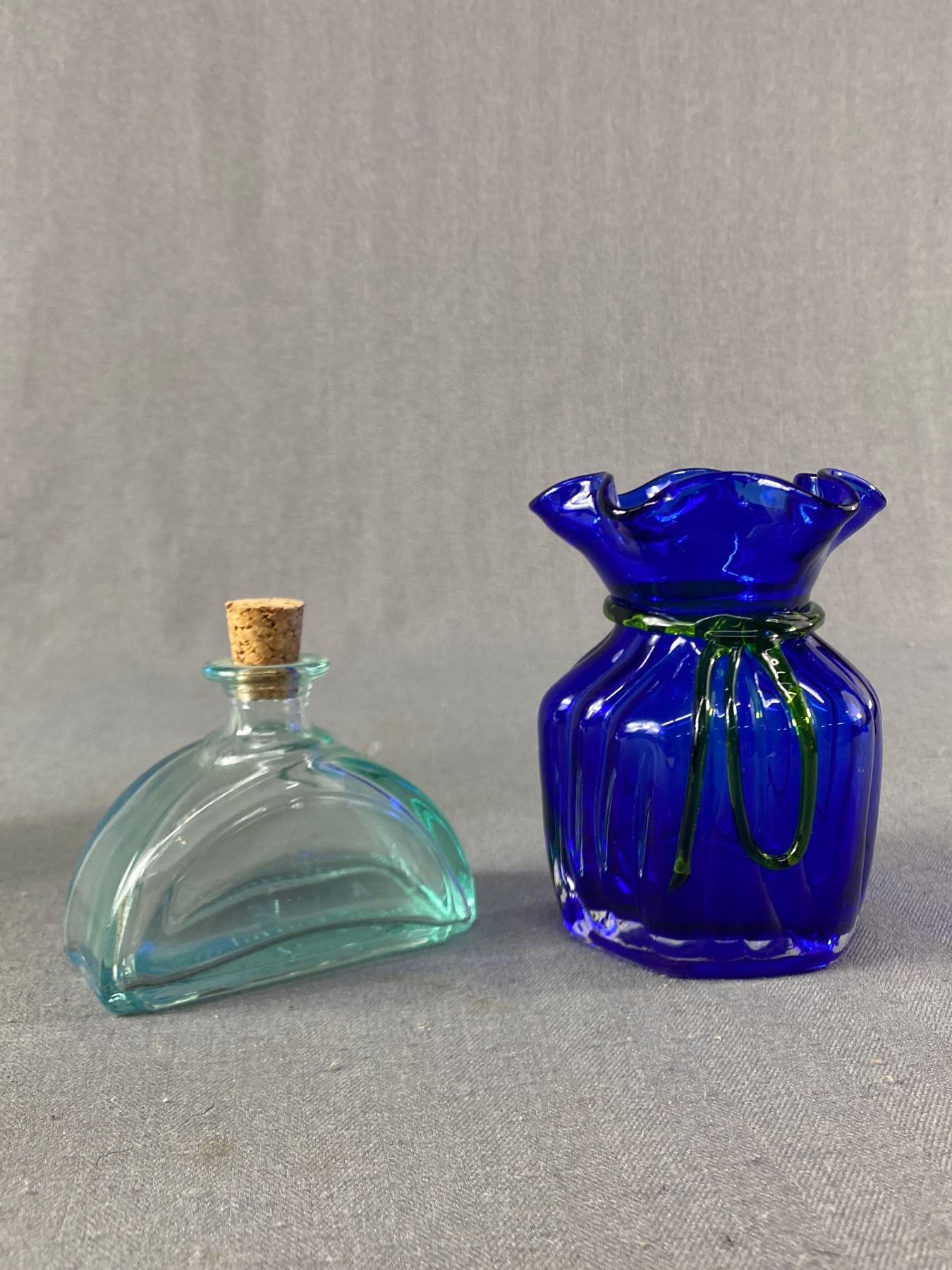 3 Decorative Glass Art- Green & White Overlay Vase, Cobalt Blown Art Glass & Painted Glass Vase + Itallian 100ml Cork Bottle