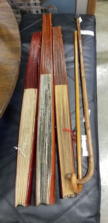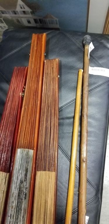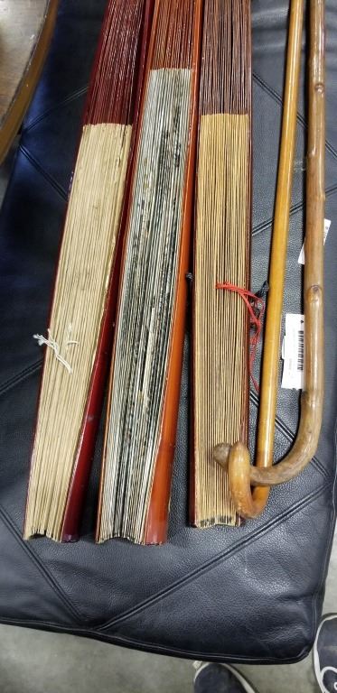3 EASTERN HAND FANS AND 2 CANES