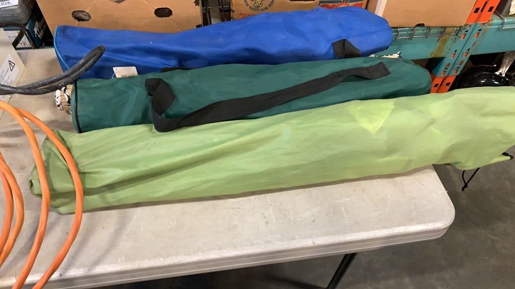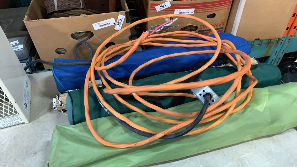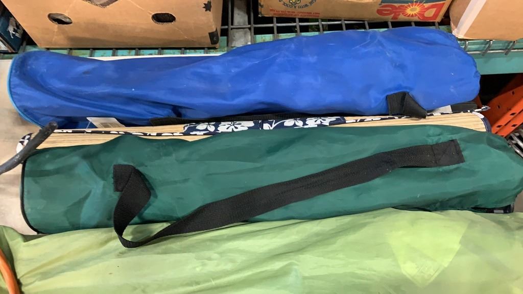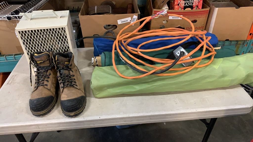 3 FOLDING CAMP CHAIRS, ROLL UP MAT, SHOP HEATER AND DAKOTA SIZE 7.5 STEEL TOE WORK BOOTS