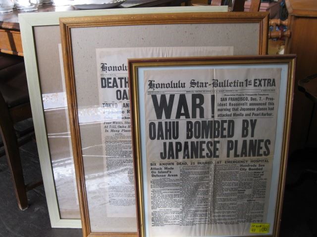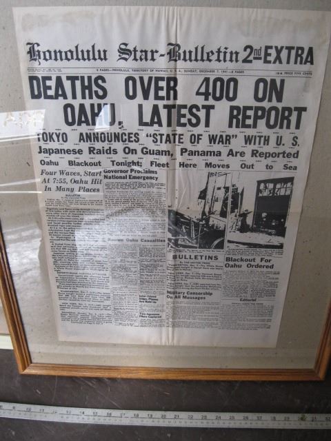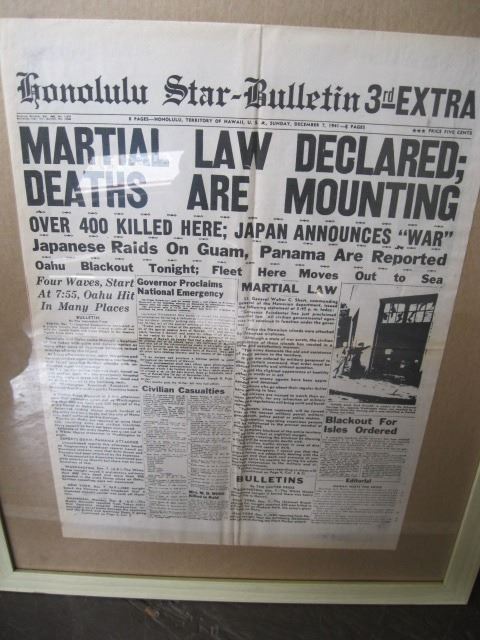 3 FRAMED HONOLULU STAR BULLETIN NEWSPAPERS FROM SUNDAY DEC 7TH 1941
