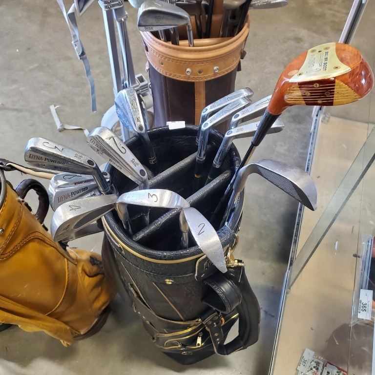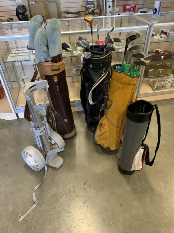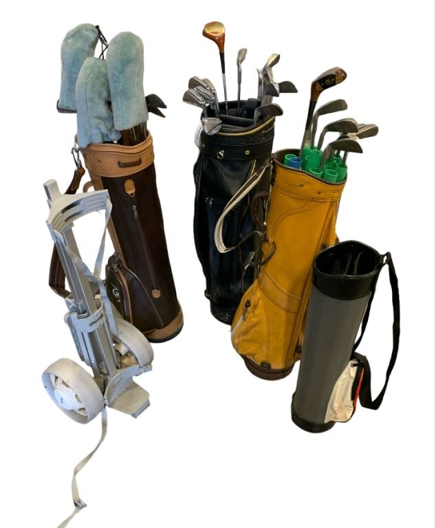 3 GOLF BAGS WITH ASSORTED CLUBS