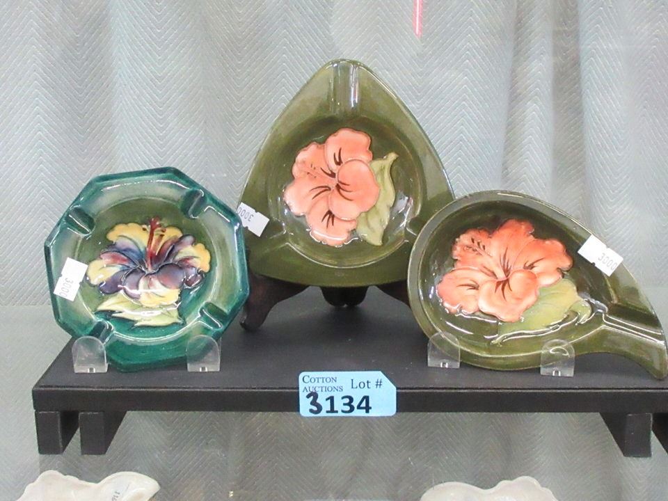 The largest triangle ashtray measures 5.5" x 6". All are marked Moorcroft.