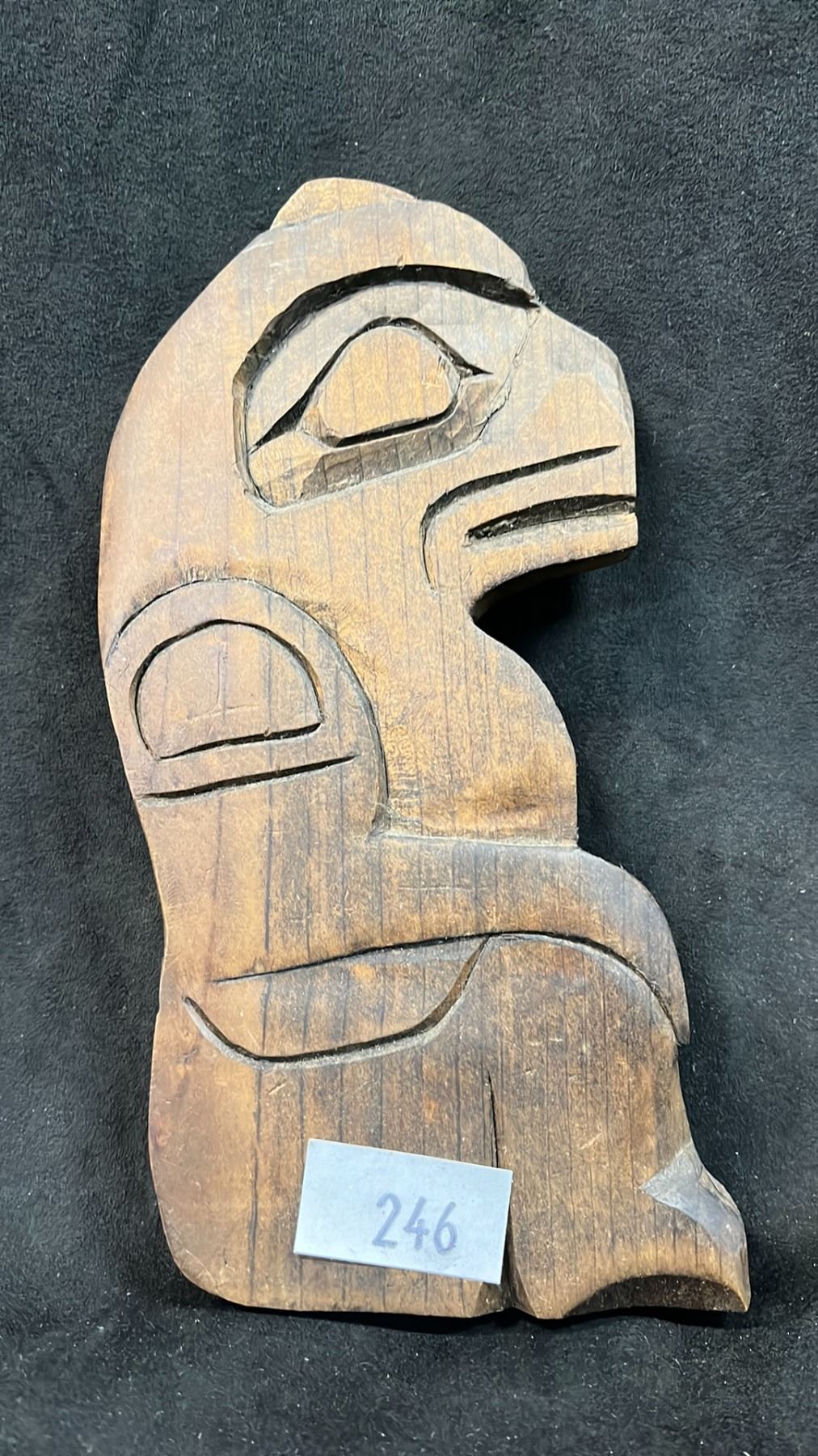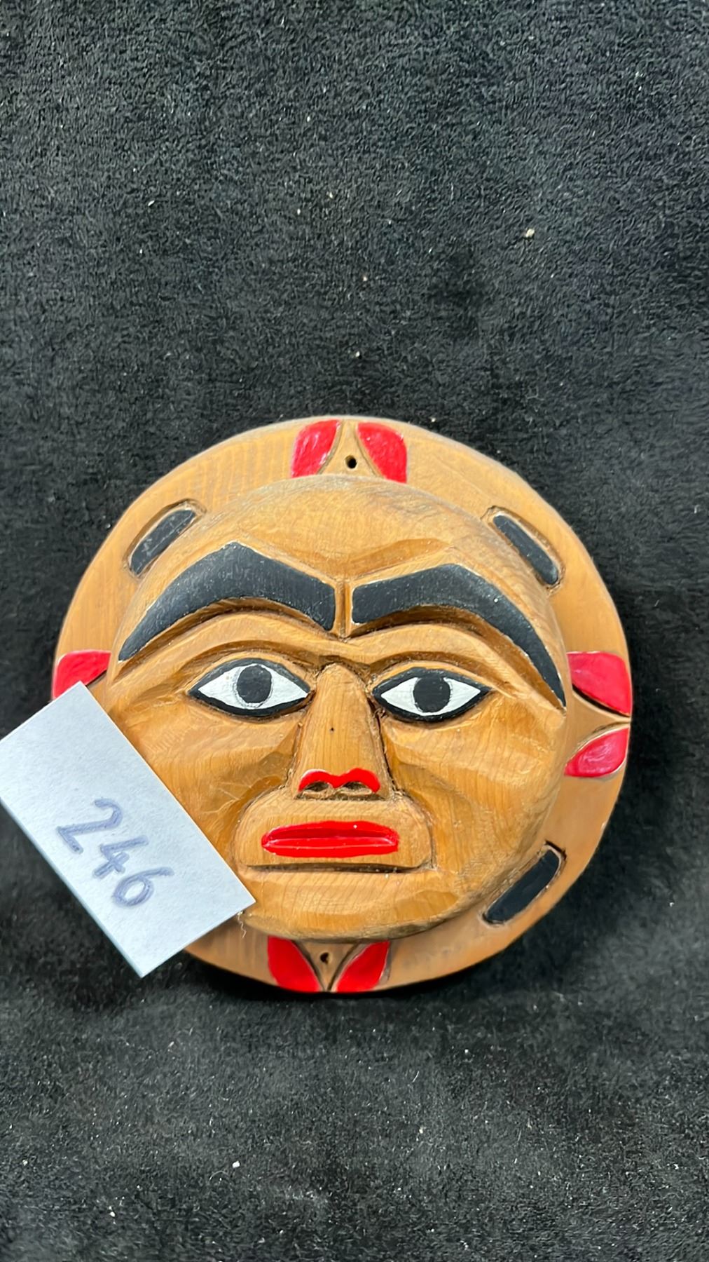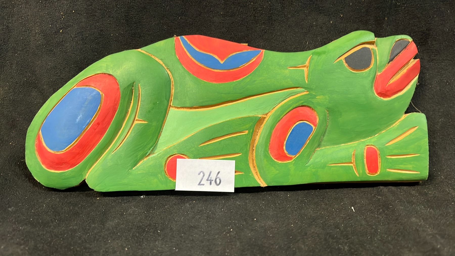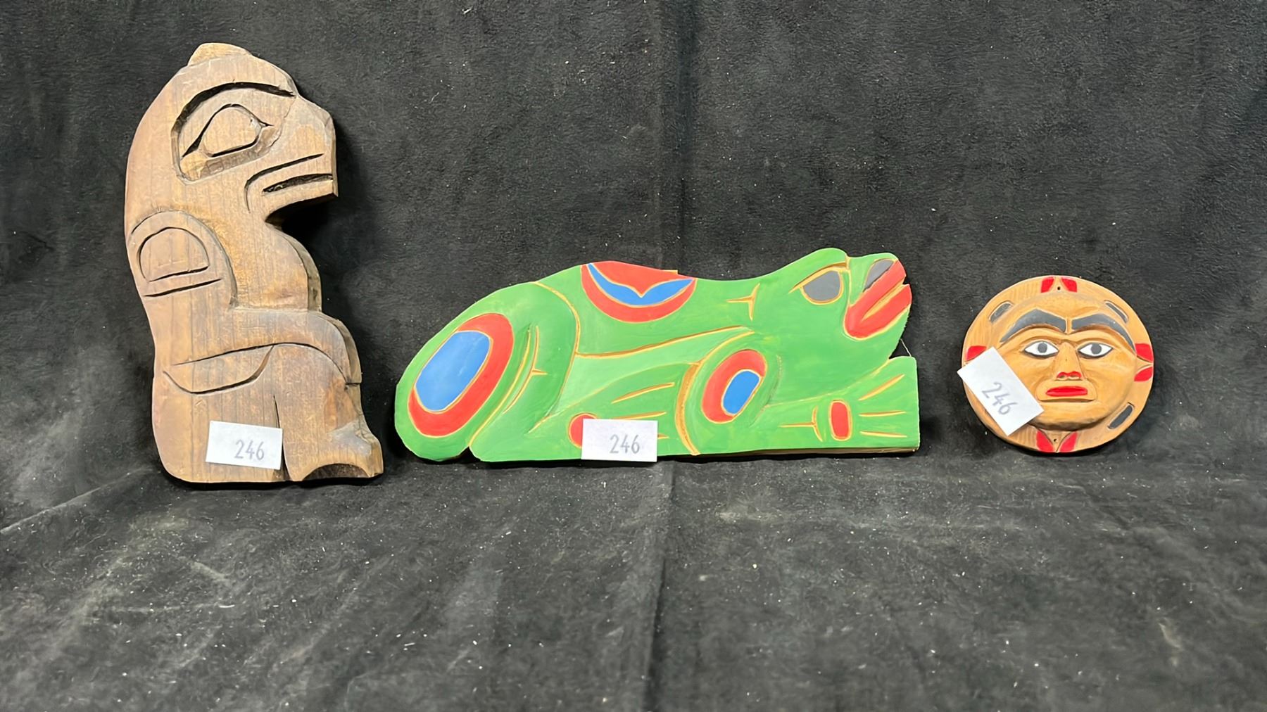3 HAND CARVED FIRST NATIONS PLAQUES BY ASSORTED ARTISTS "FROG" BY GARRY JIM 10" X 4" "BEAR" 8" X 4" "SUN" 3"