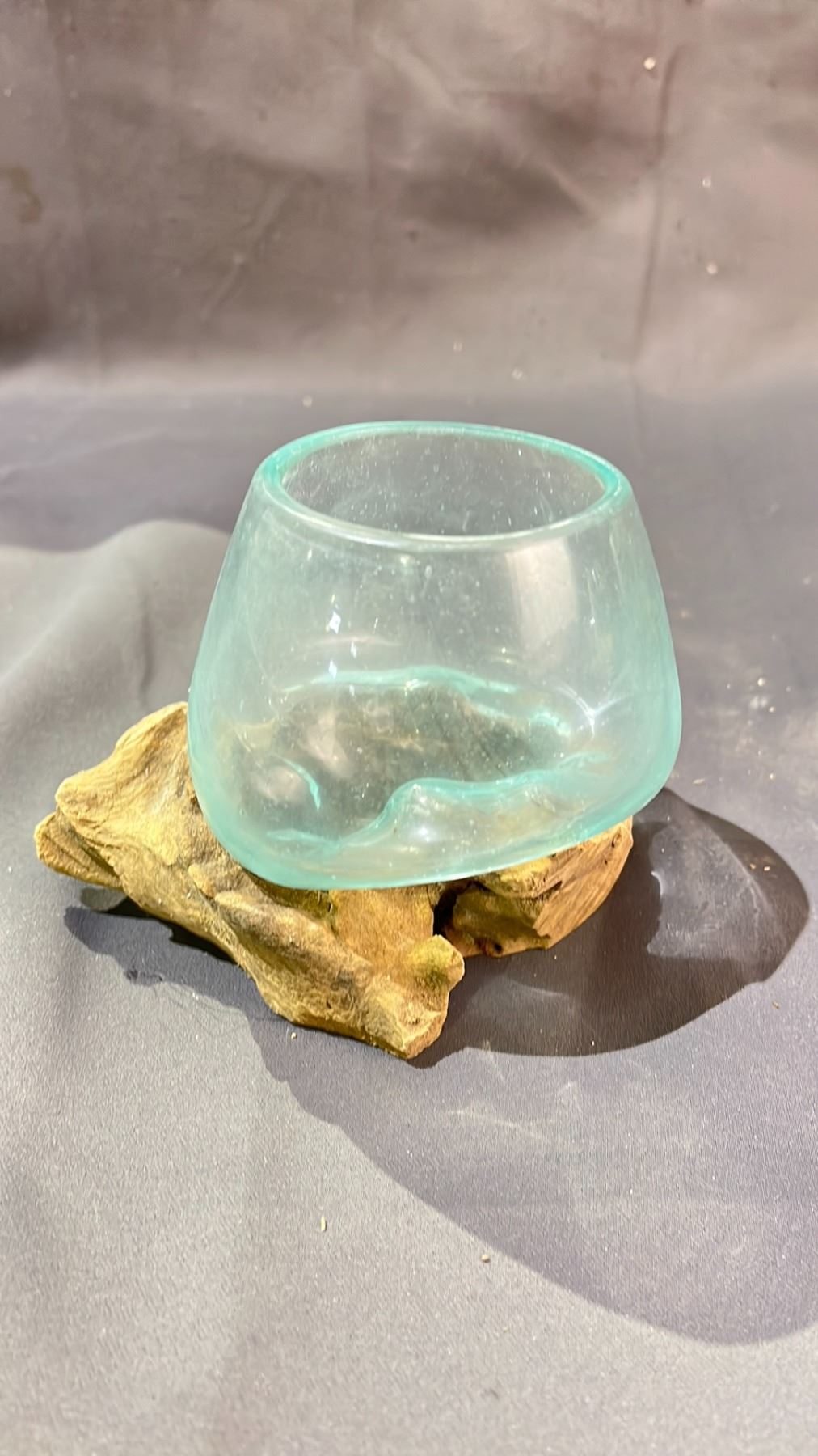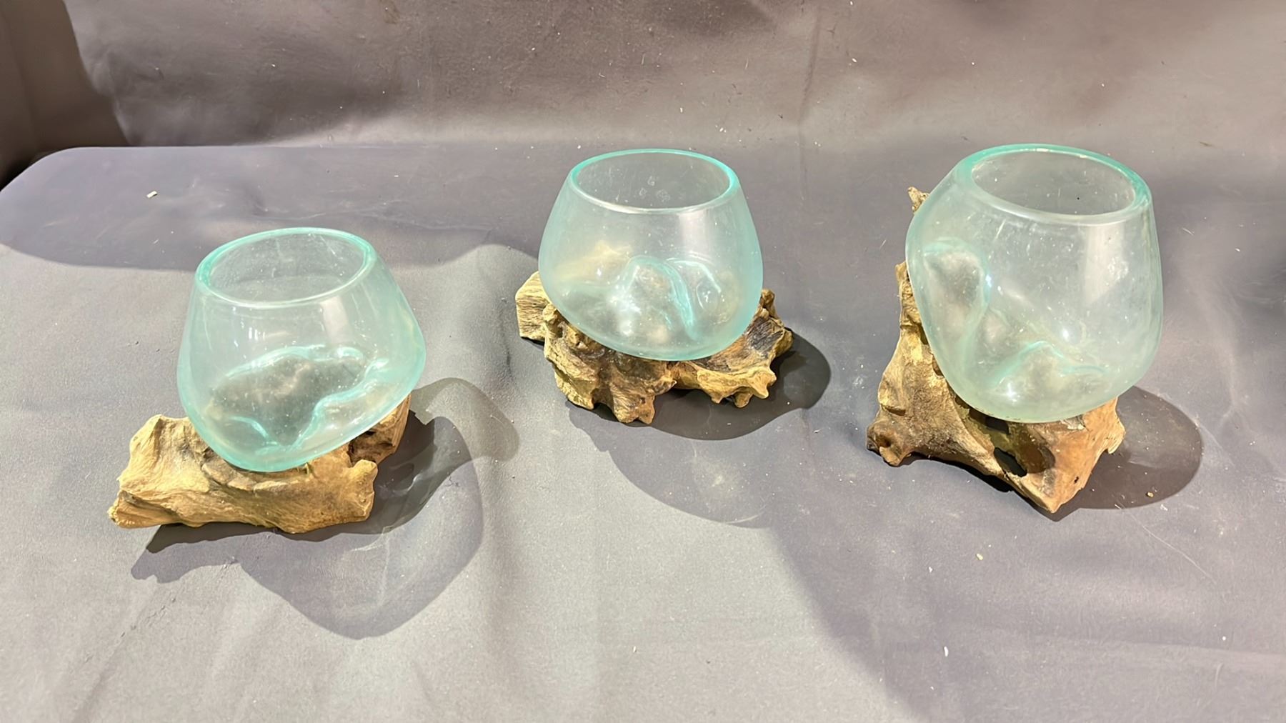 3- HAND MADE MOLTEN GLASS BOWLS ON TEAK BASES