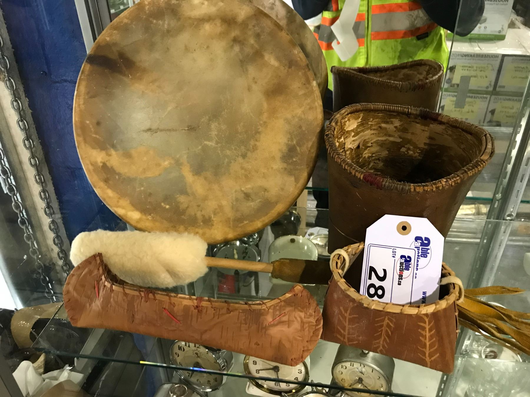 3 HANDMADE BIRCHWOOD ITEMS (SMALL BASKETS AND CANOE) AND FIRST NATIONS DRUM