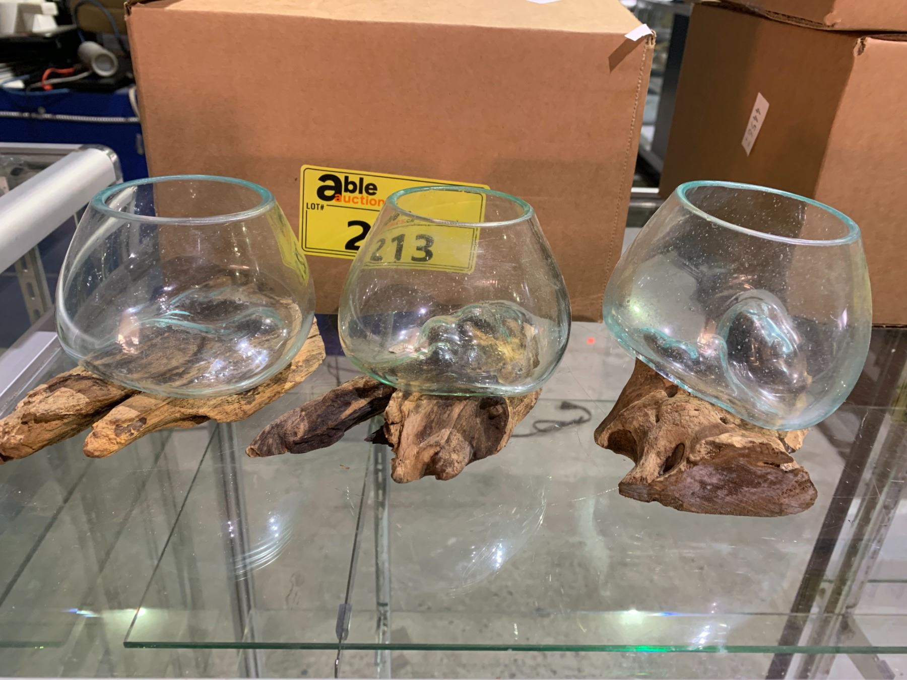 3 HANDMADE MOLTEN GLASS BOWLS ON TEAK WOOD BASES