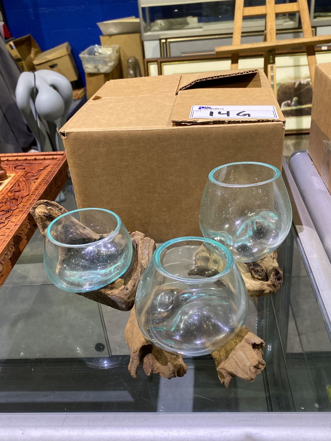 3 HANDMADE MOLTEN GLASS BOWLS ON TEAK WOOD BASES