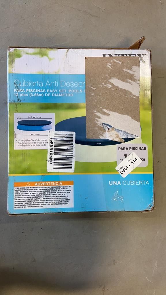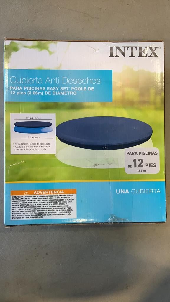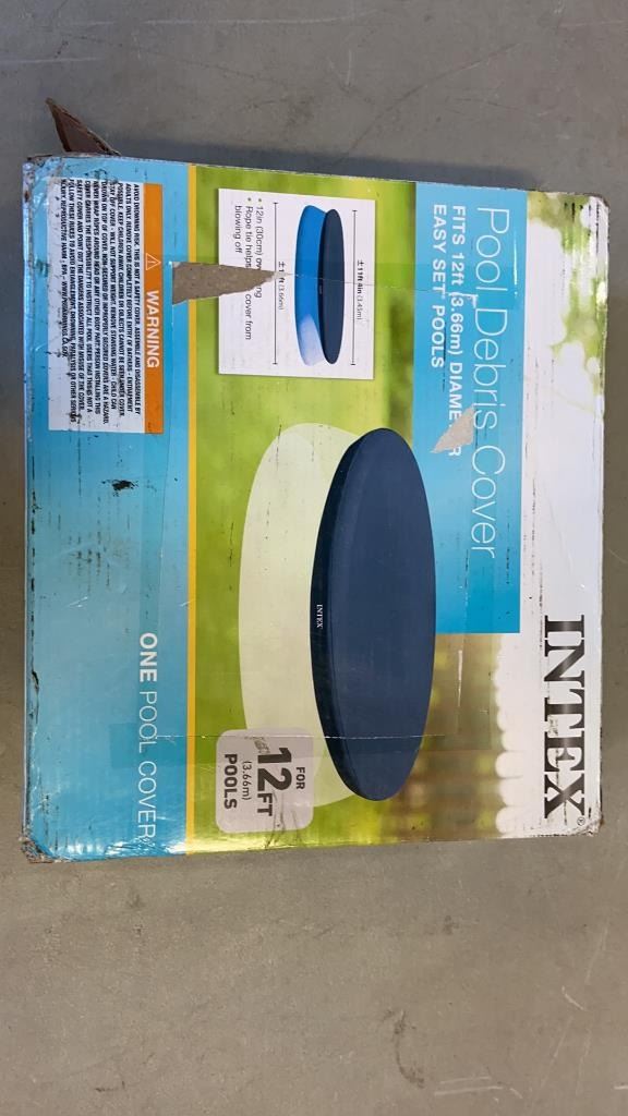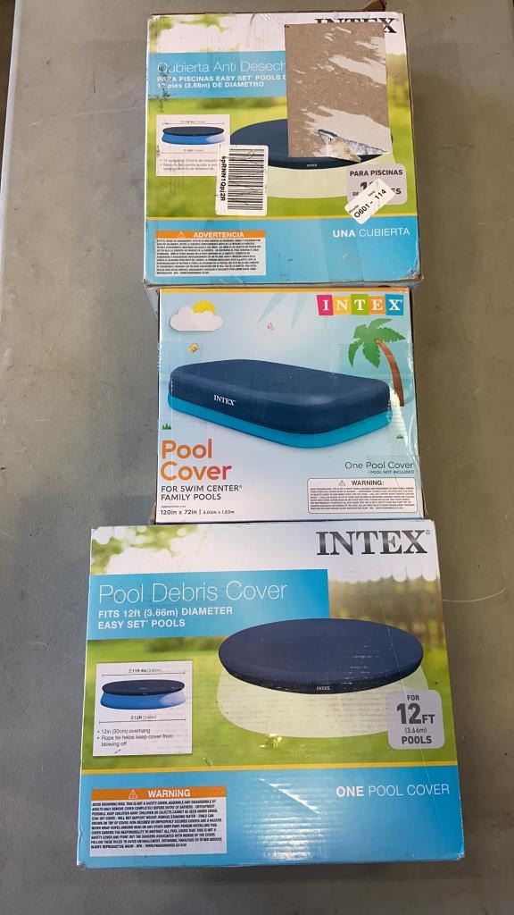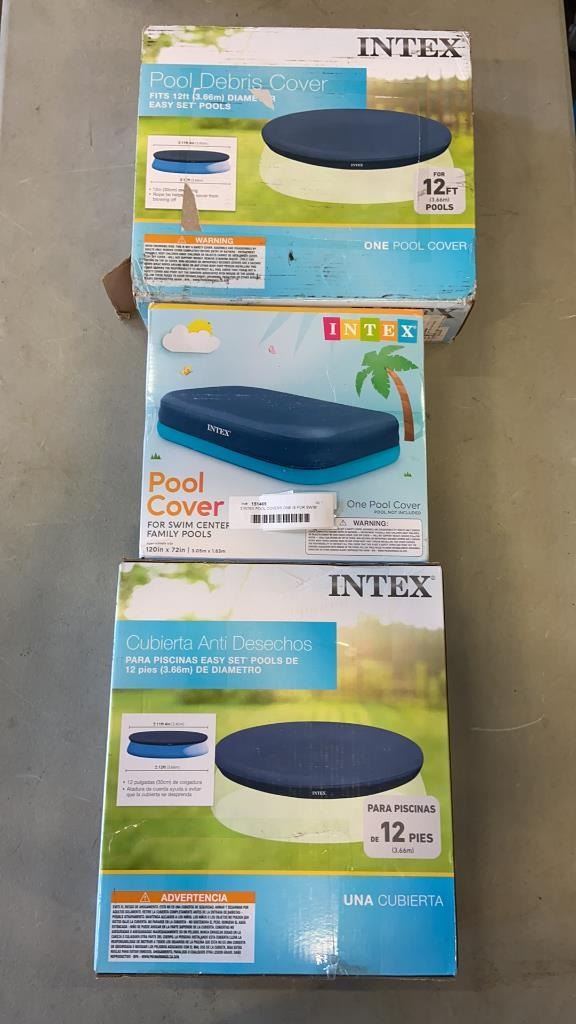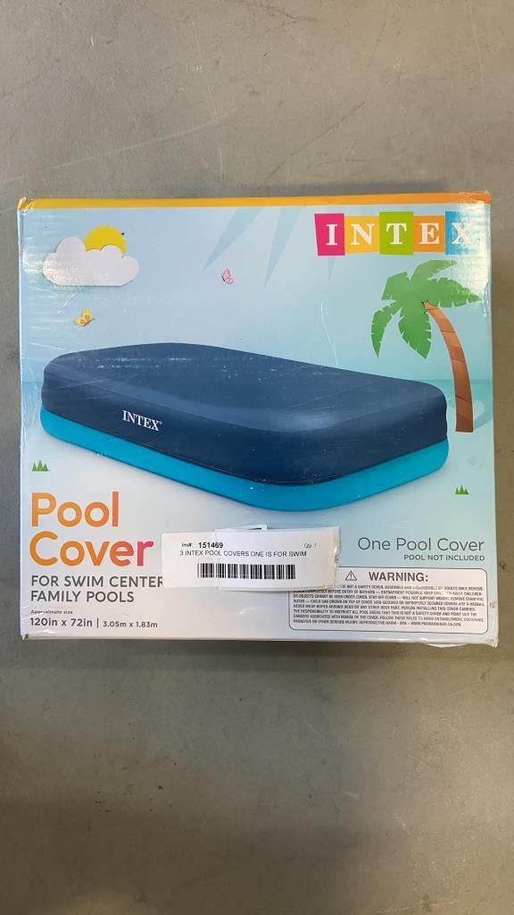 3 INTEX POOL COVERS ONE IS FOR SWIM CENTER FAMILY POOL AND 2 ARE FOR 12 FOOT DIAMETER ROUND POOLS