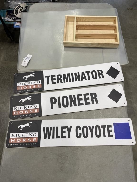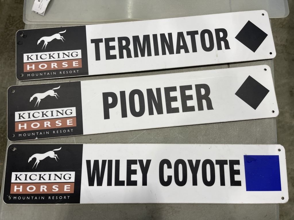3 KICKING HORSE SKI RUN SIGNS FROM GOLDEN, B.C.AND TWO CLEAR MATS