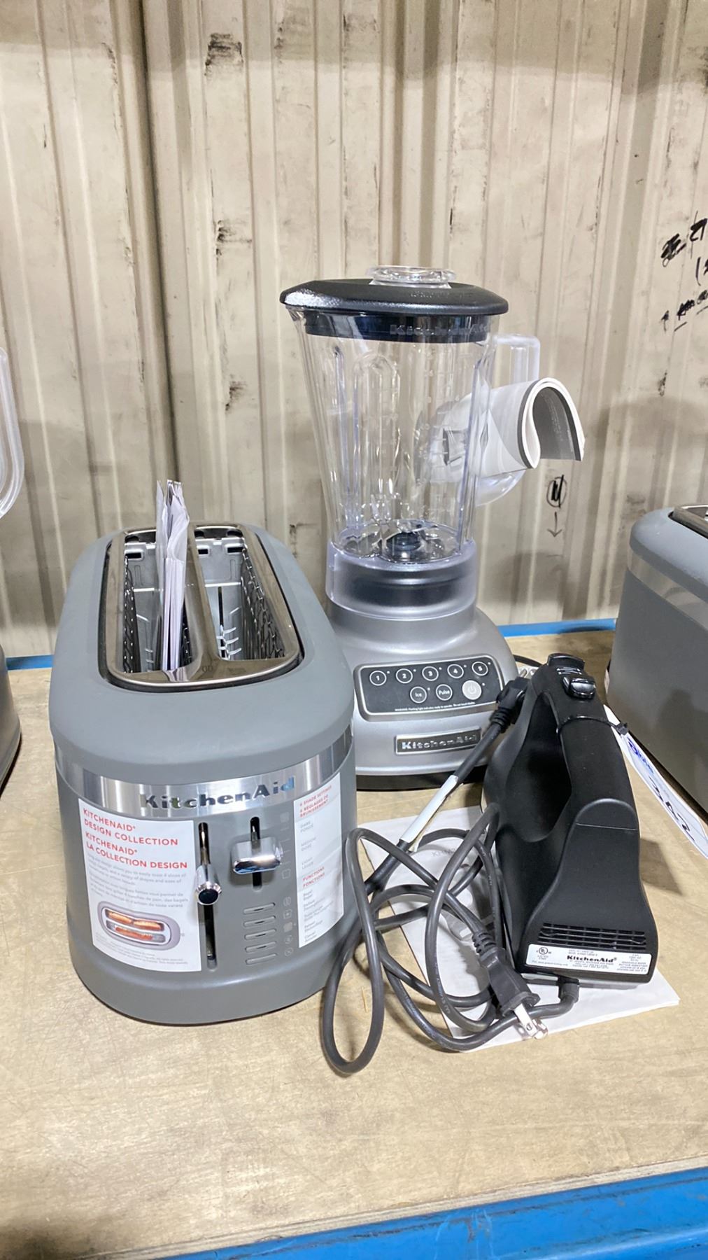 3 KITCHENAID COUNTERTOP ELECTRIC SMALL APPLIANCES INCLUDING: KITCHENAID LARGE SLICE TOASTER, KITCHENAID MULTI SPEED BLENDER, & KITCHENAID ELECTRIC HAND BLENDER *NO BEATERS*