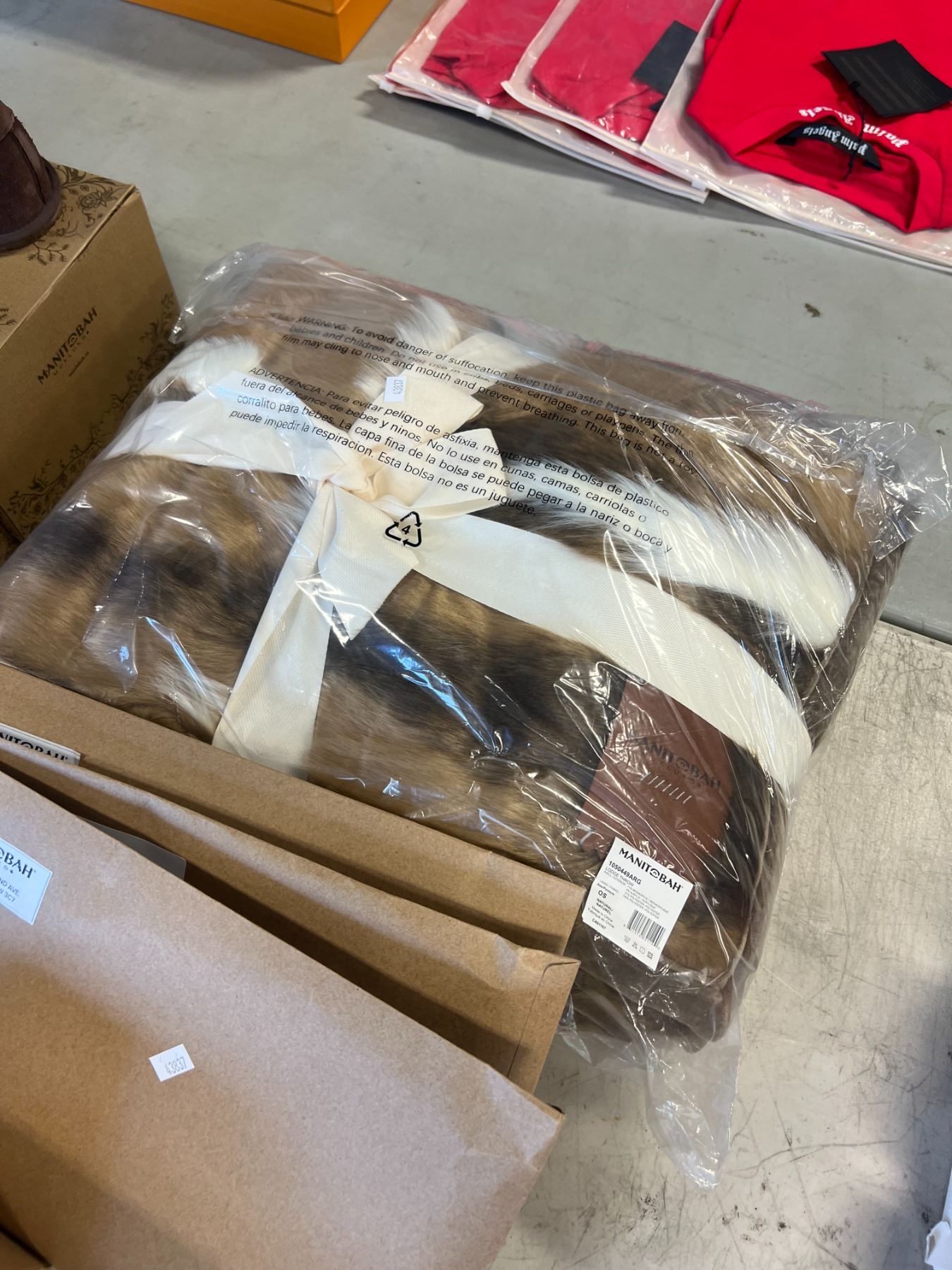 3 MANITOBAH MUKLUKS / MOCCASINS CARE KITS, 4 ASSORTED MANITOBAH MUKLUKS SHEEP SKIN INSOLES, AND MANITOBAH LODGE THROW BLANKET